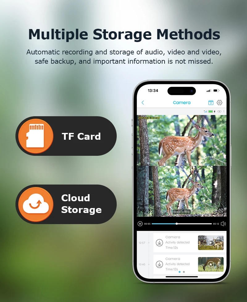 * Cuando la cámara detecta movimiento, se activa rápidamente y graba vídeo, guardándolo en la tarjeta SD o en la nube.