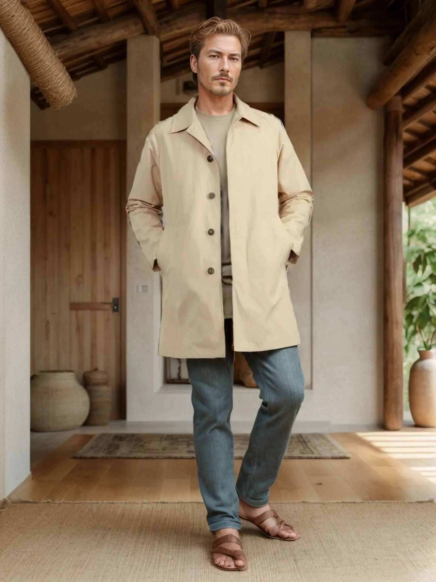 Chaqueta informal para hombre, otoño 2024, gabardina larga, color liso, solapa, corte ajustado, cárdigan de un solo botón, estilo casual y elegante.