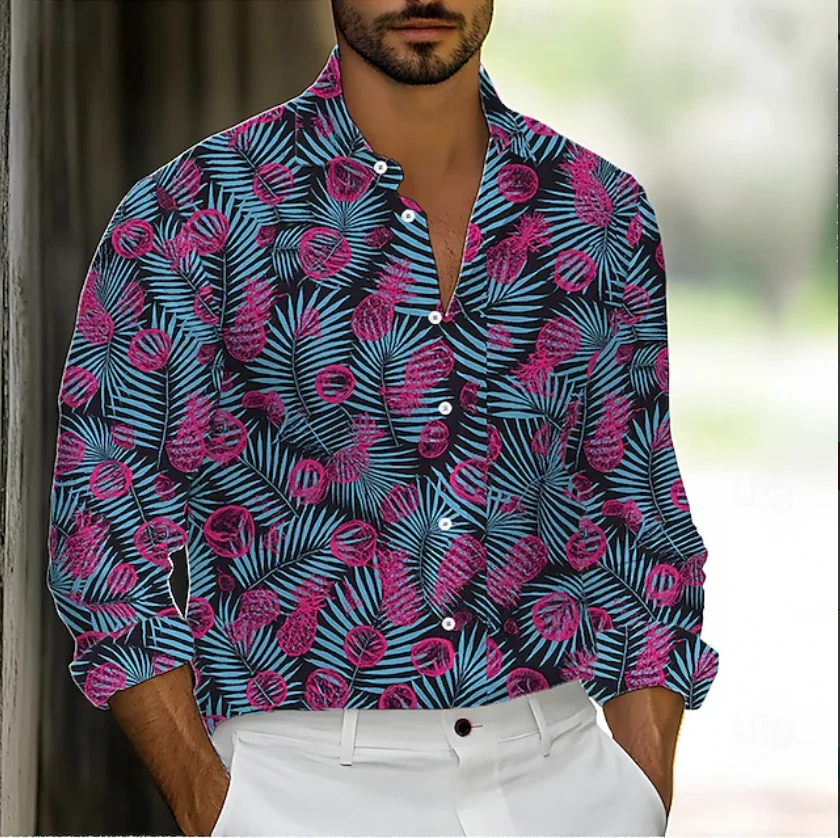 Camisa de hombre abotonada, estilo casual, primavera/verano, estampado 3D de hojas y flores, manga larga, cómoda y a la moda para el día a día.