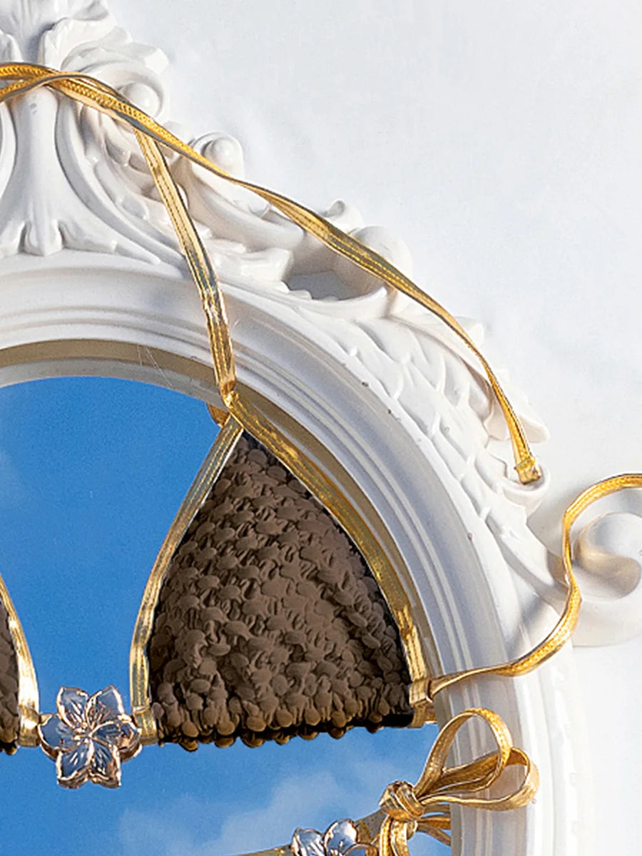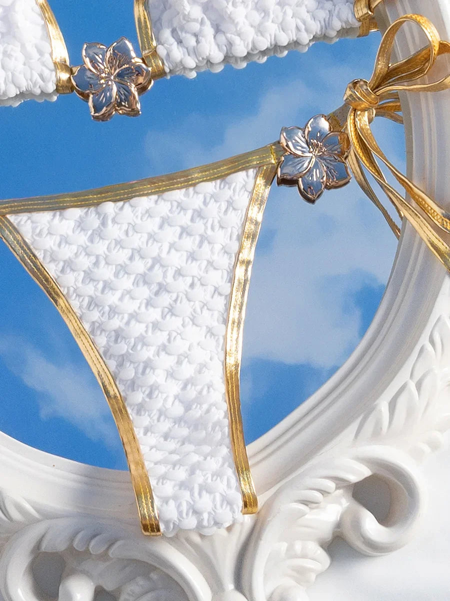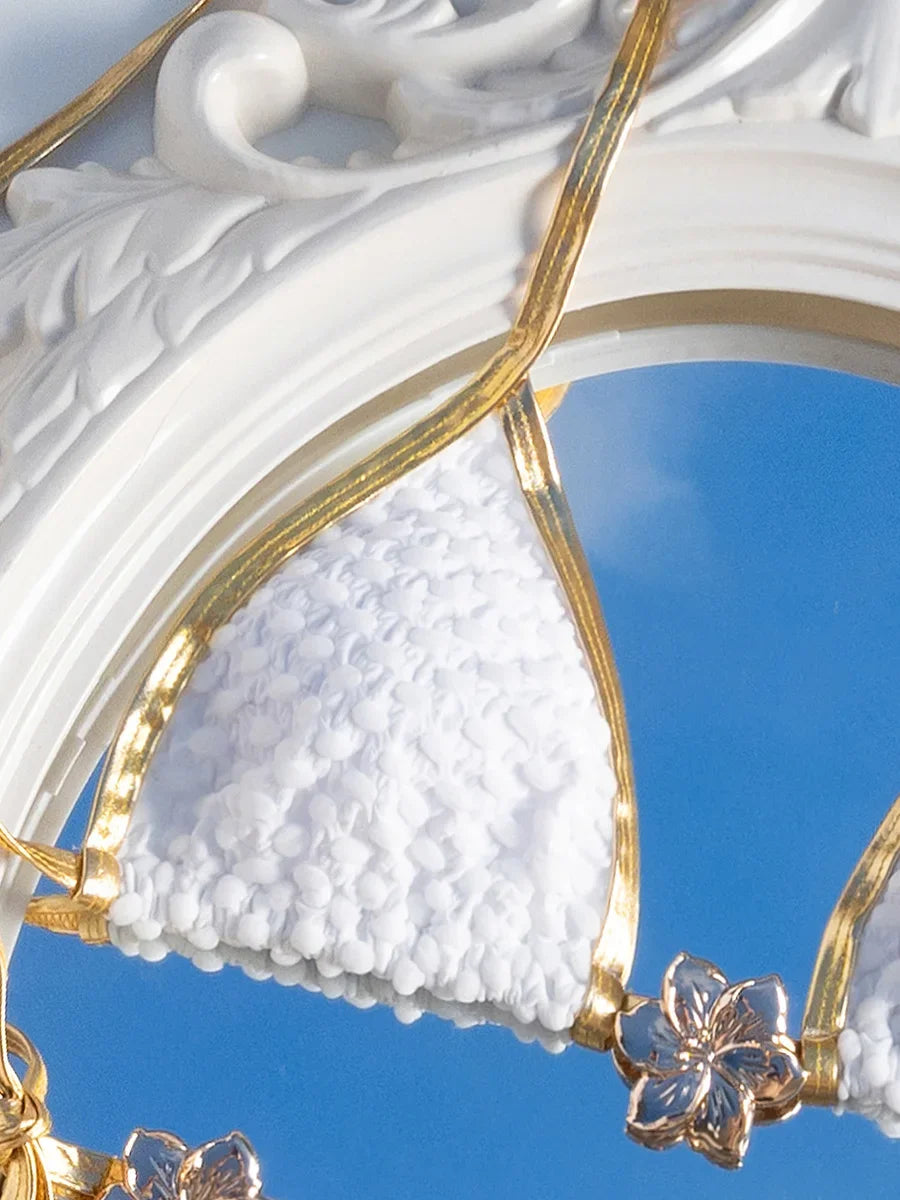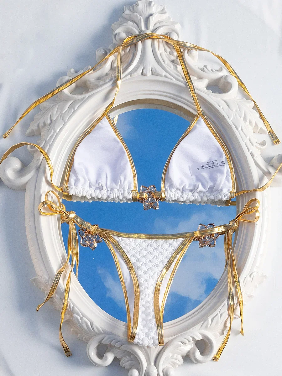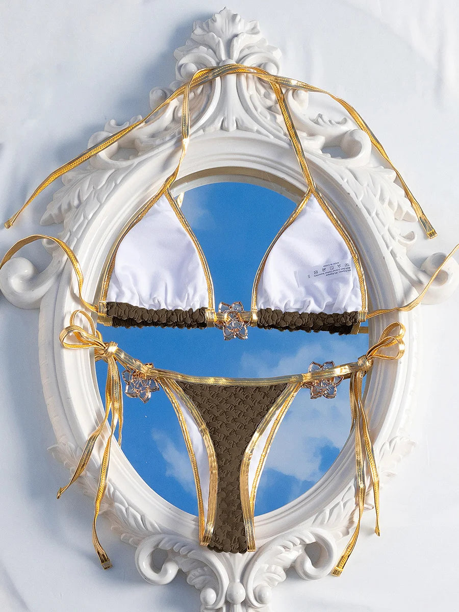 Bikini de dos piezas con cuello halter y fruncido de flores de metal para mujer