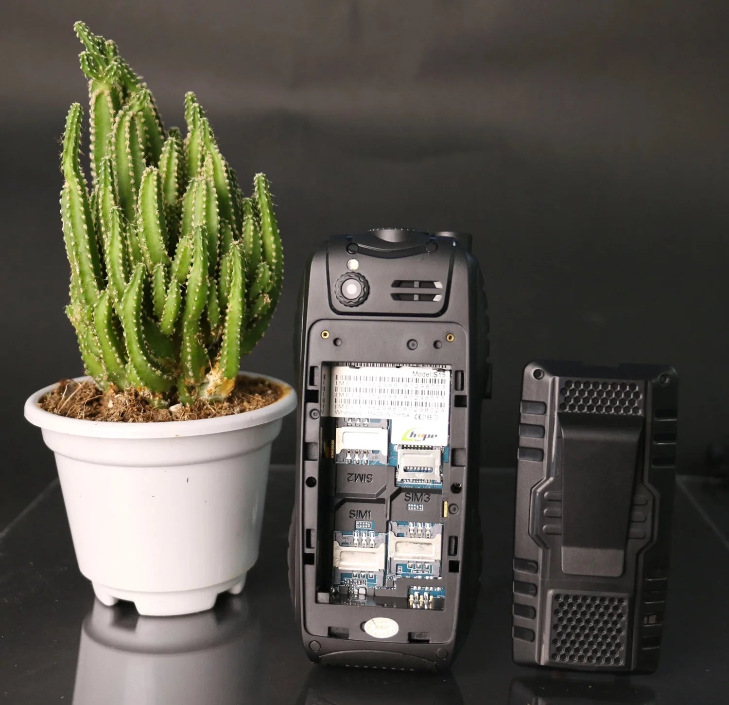 Teléfono militar a prueba de golpes con batería de gran capacidad, 3 SIM, botón SOS, voz potente, marcación rápida, clip integrado, resistente y funcional para personas mayores.