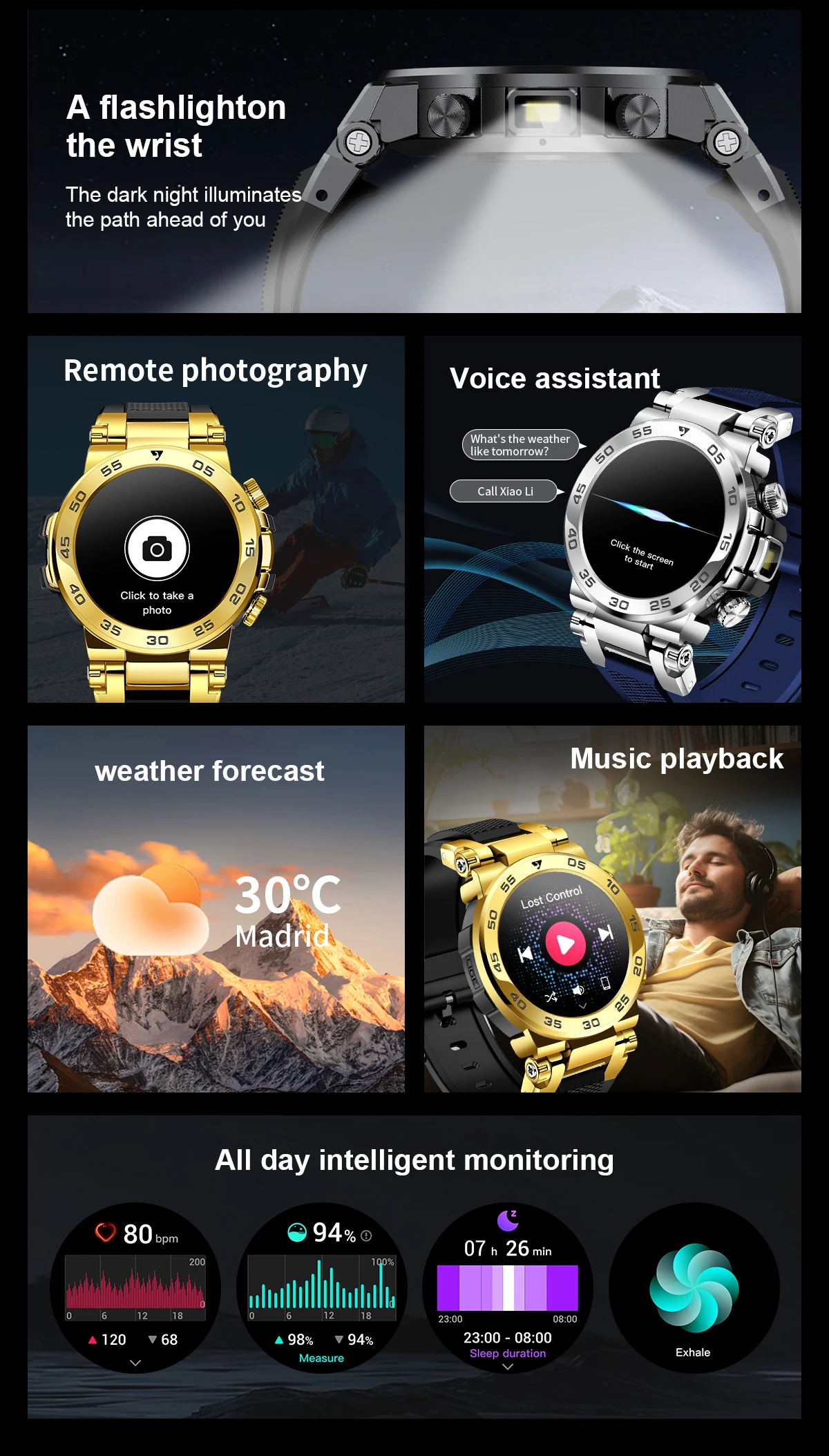 Función : pasómetro, rastreador de actividad física, rastreador de sueño, recordatorio de mensajes, recordatorio de llamadas, responder llamadas, marcar llamadas, mensaje push, tres agujas grandes, instrucción de 24 horas, cronógrafo, despertador, segundero pequeño, hora mundial, calendario permanente, reserva de energía, semana, mes, música interactiva, noctilucente, calendario, cuenta regresiva