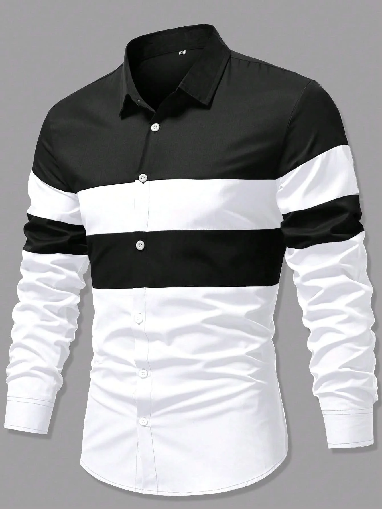 Camisa de hombre nueva, moderna, con estampado de rayas y patchwork; camisa de manga larga, cómoda y transpirable, de estilo informal elegante.
