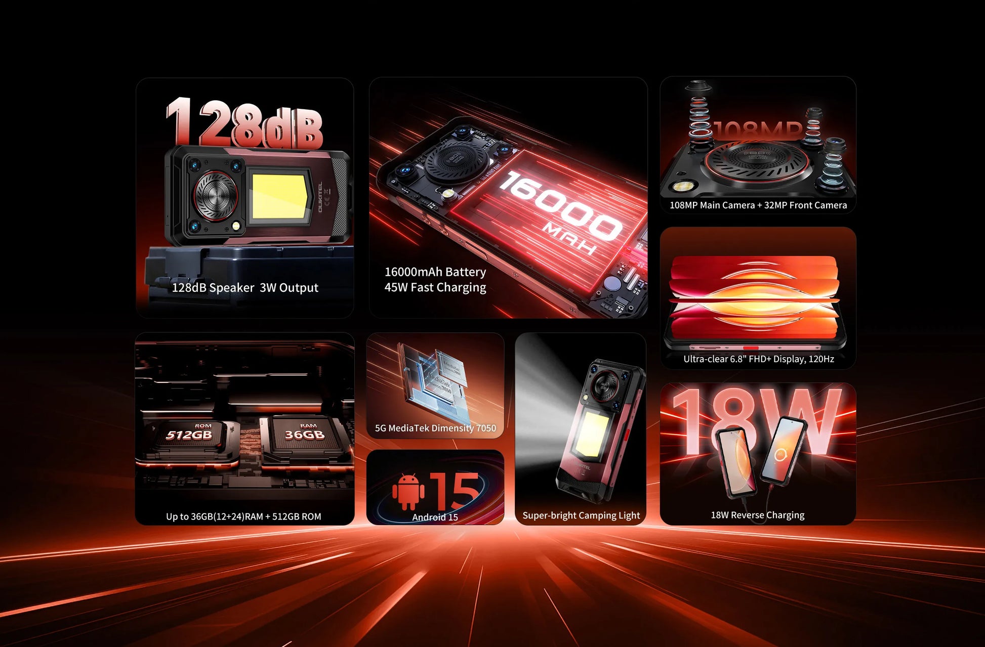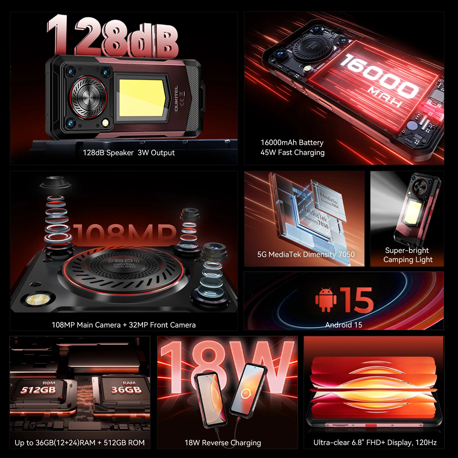 【NUEVO】OUKITEL WP56 Teléfono resistente, batería de 16000 mAh, carga de 45 W, 36 GB + 512 GB, pantalla FHD de 6.8" a 120 Hz, procesador MTK7050, cámara de 32 MP + 108 MP, Android 15