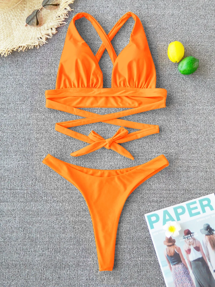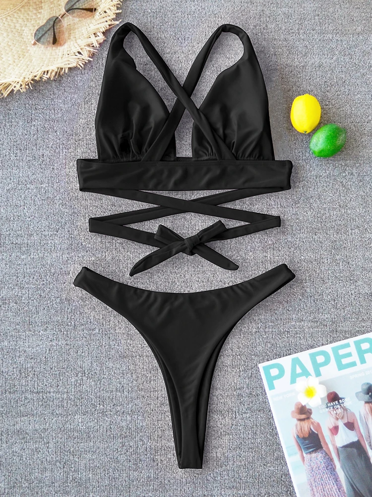 Bikini sexy 2025, traje de baño liso para mujer, traje de baño para mujer, conjunto de bikini push up con vendaje cruzado, traje de baño para playa, traje de baño
