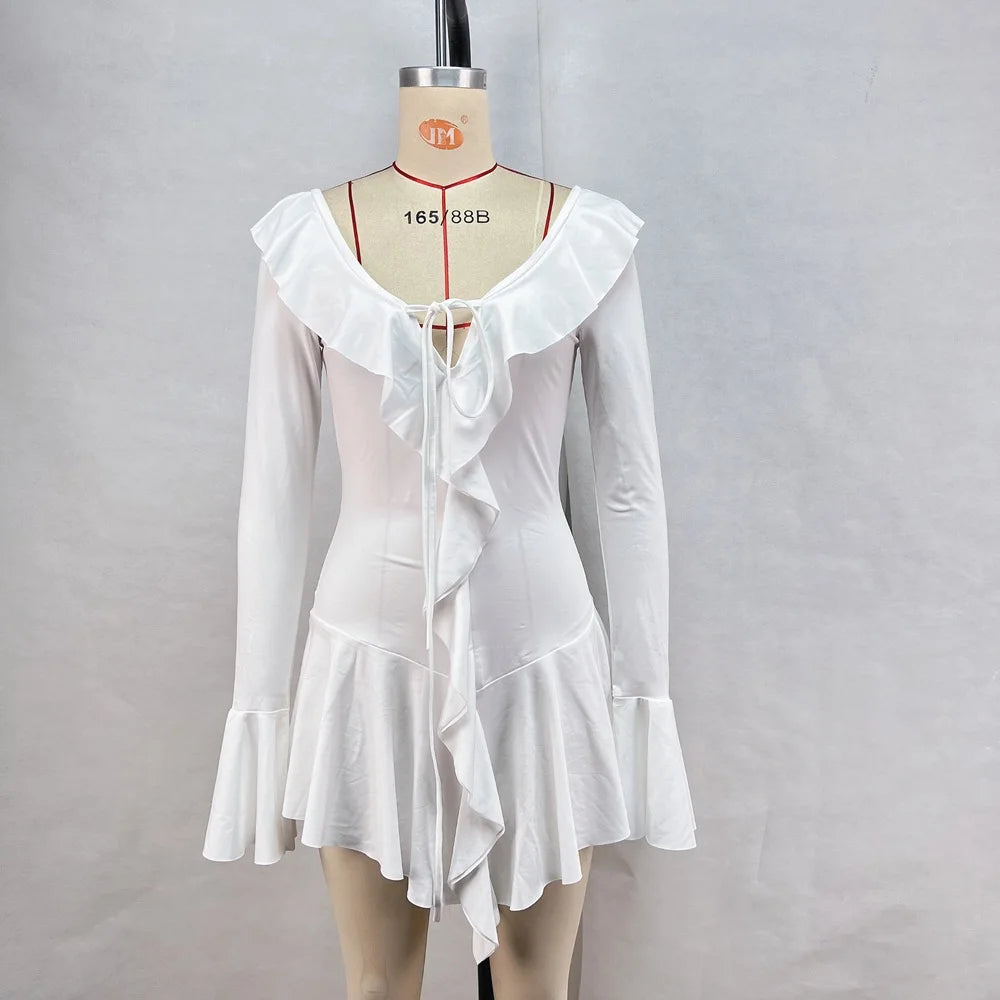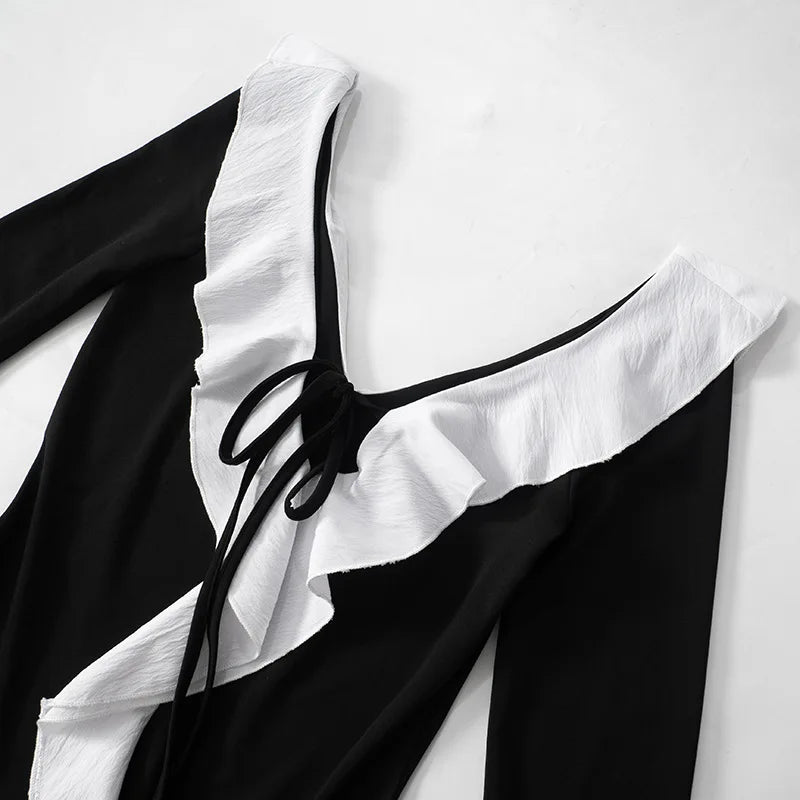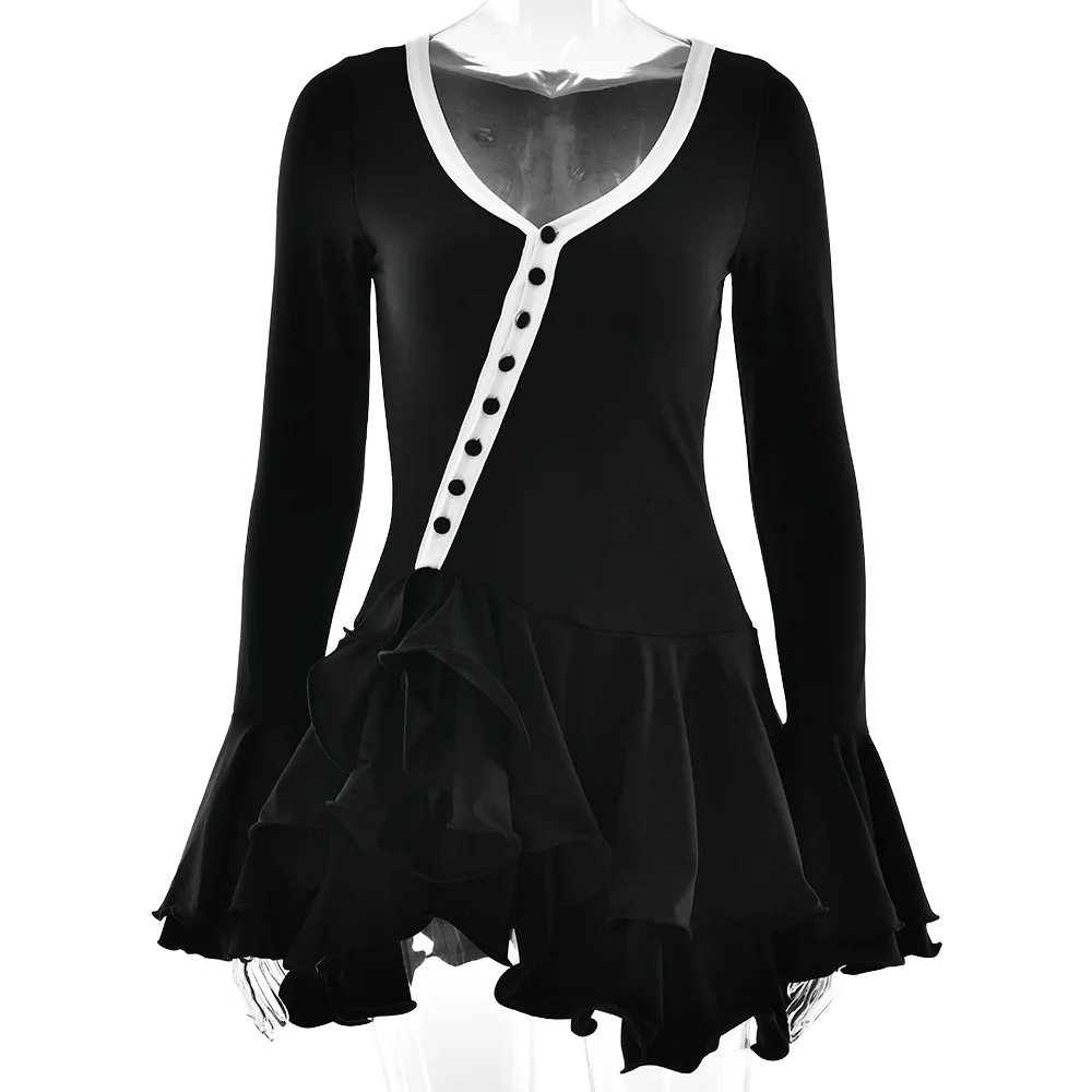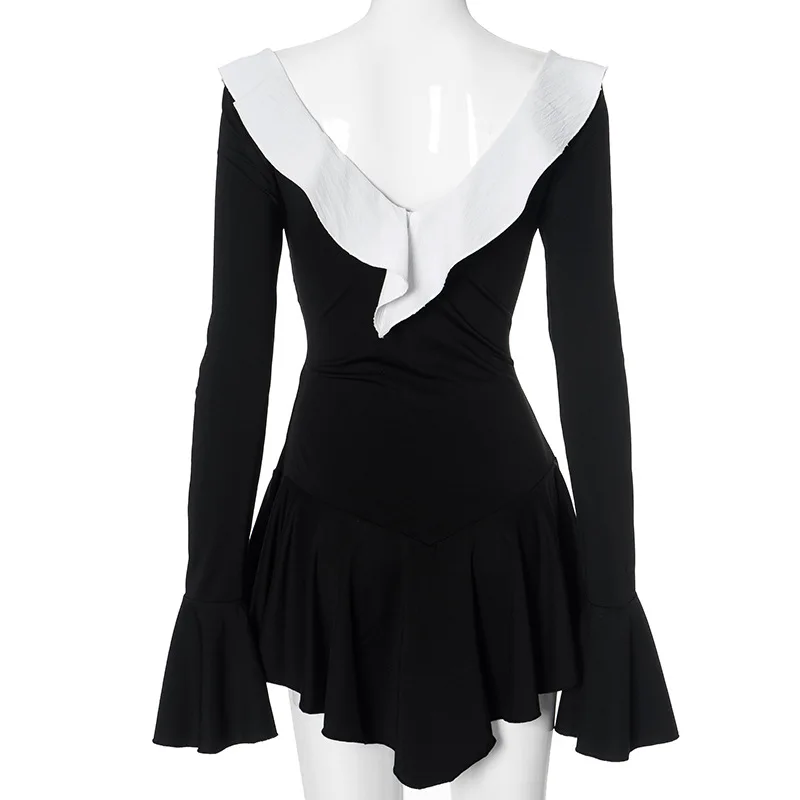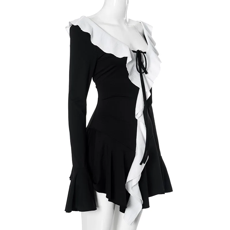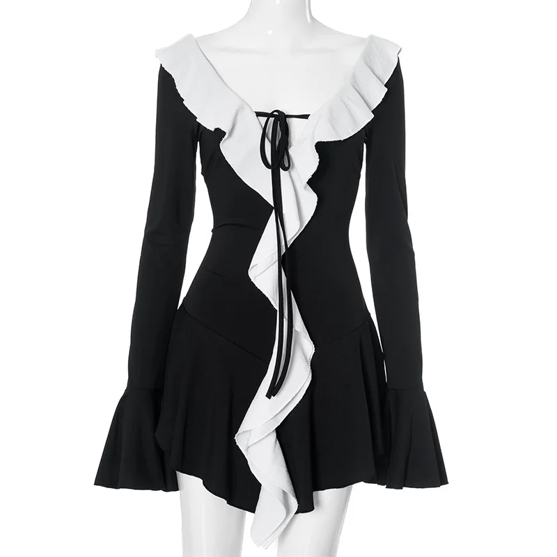 Vestido corto de mujer con volantes, patchwork blanco y negro, manga larga acampanada, encaje y cordones, para fiesta, noche, mini vestido, azul, rosa, rojo.