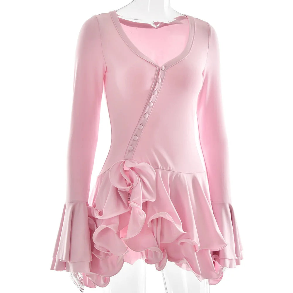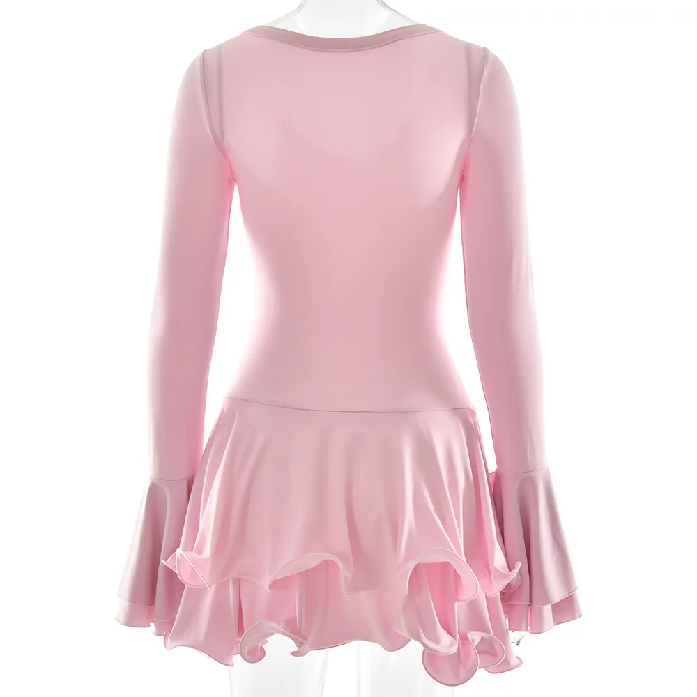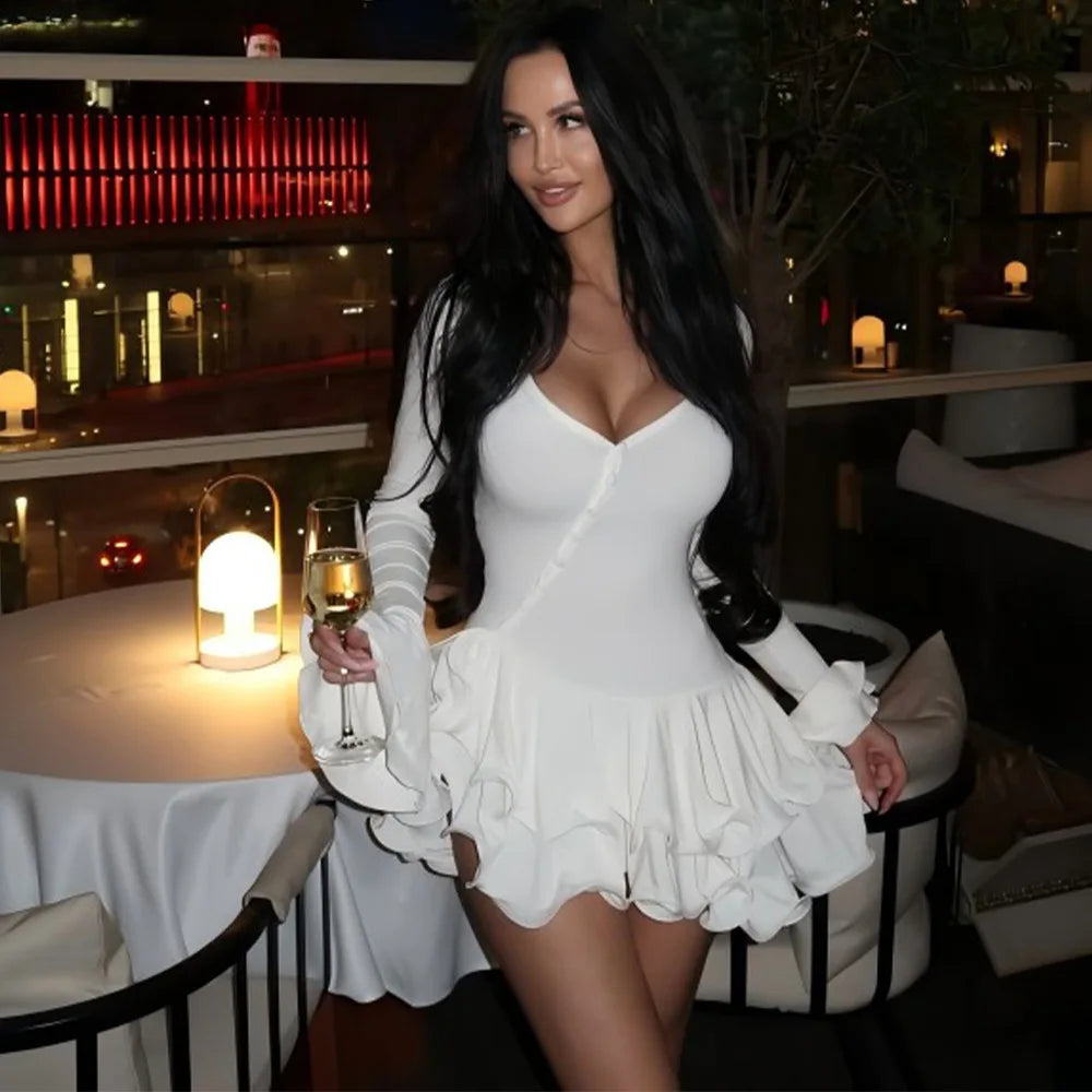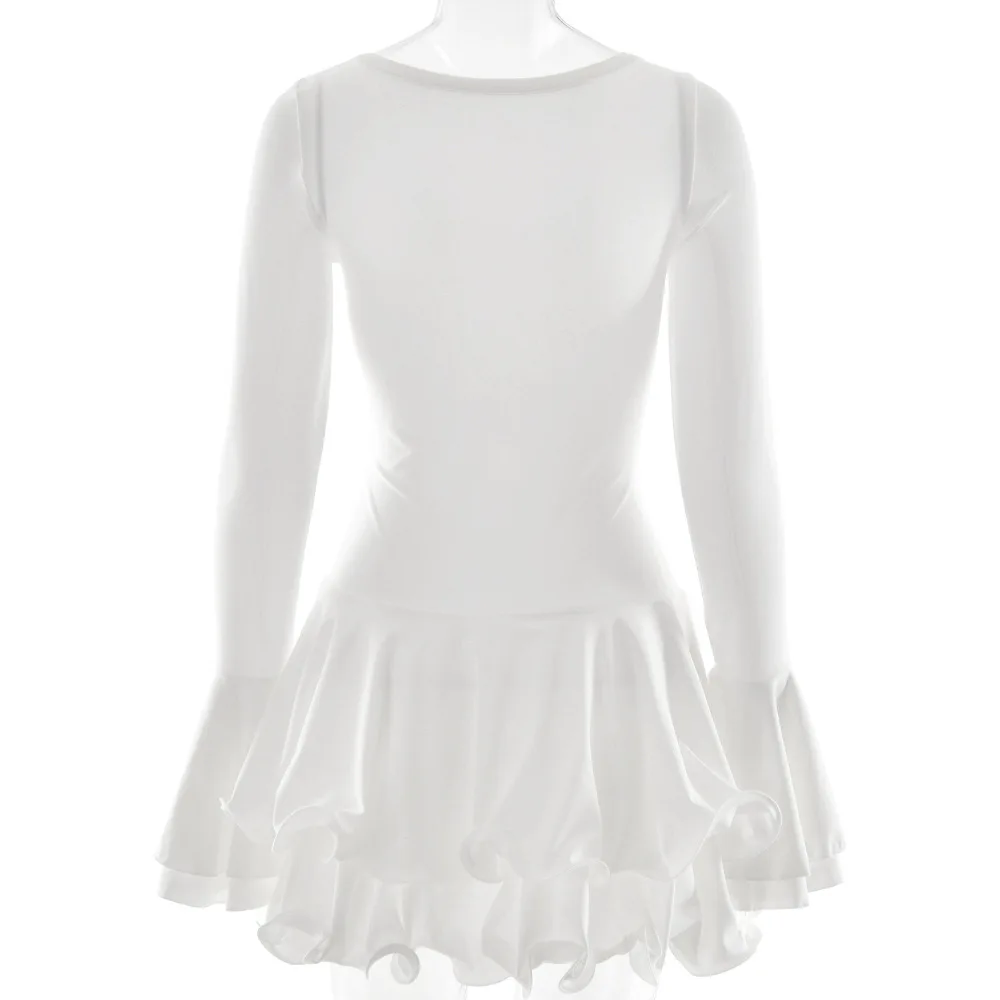 Vestido corto de mujer con volantes, patchwork blanco y negro, manga larga acampanada, encaje y cordones, para fiesta, noche, mini vestido, azul, rosa, rojo.