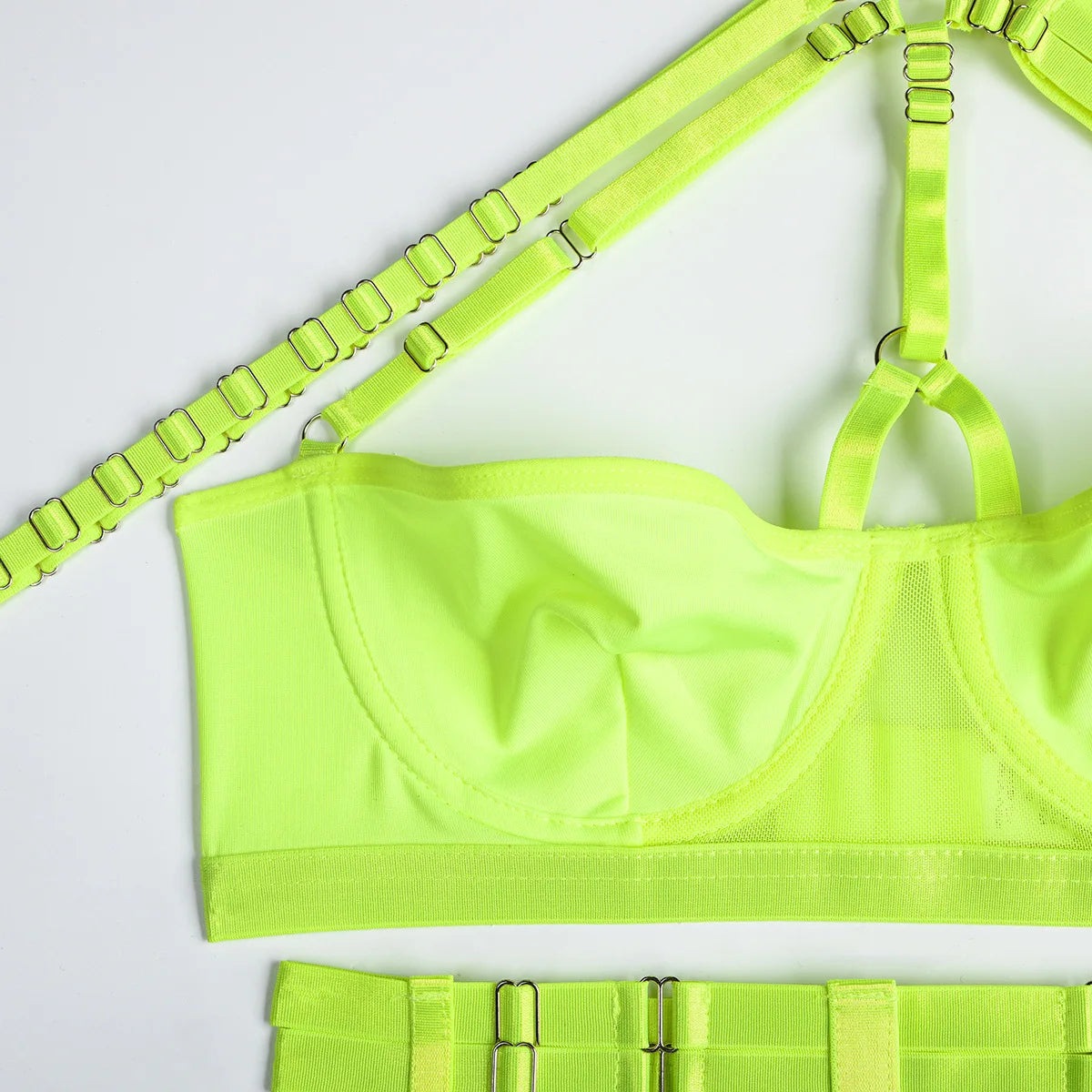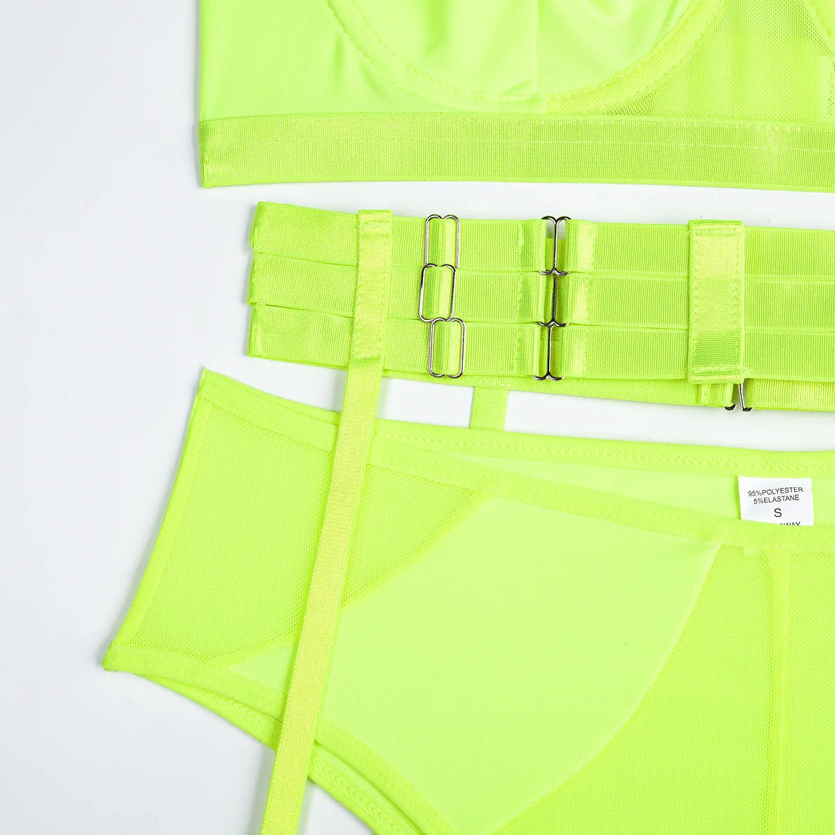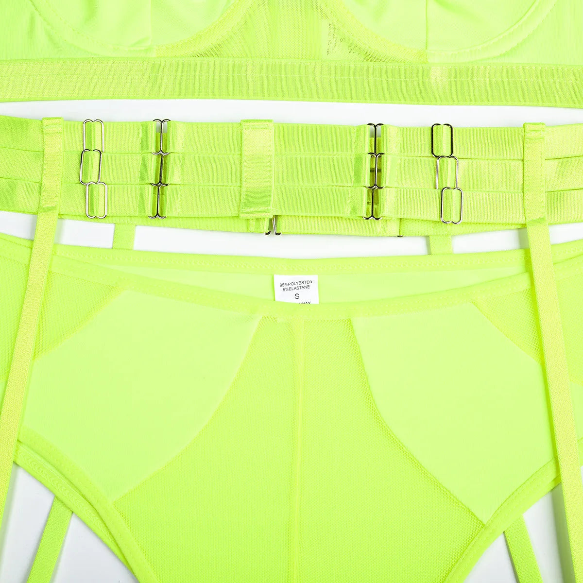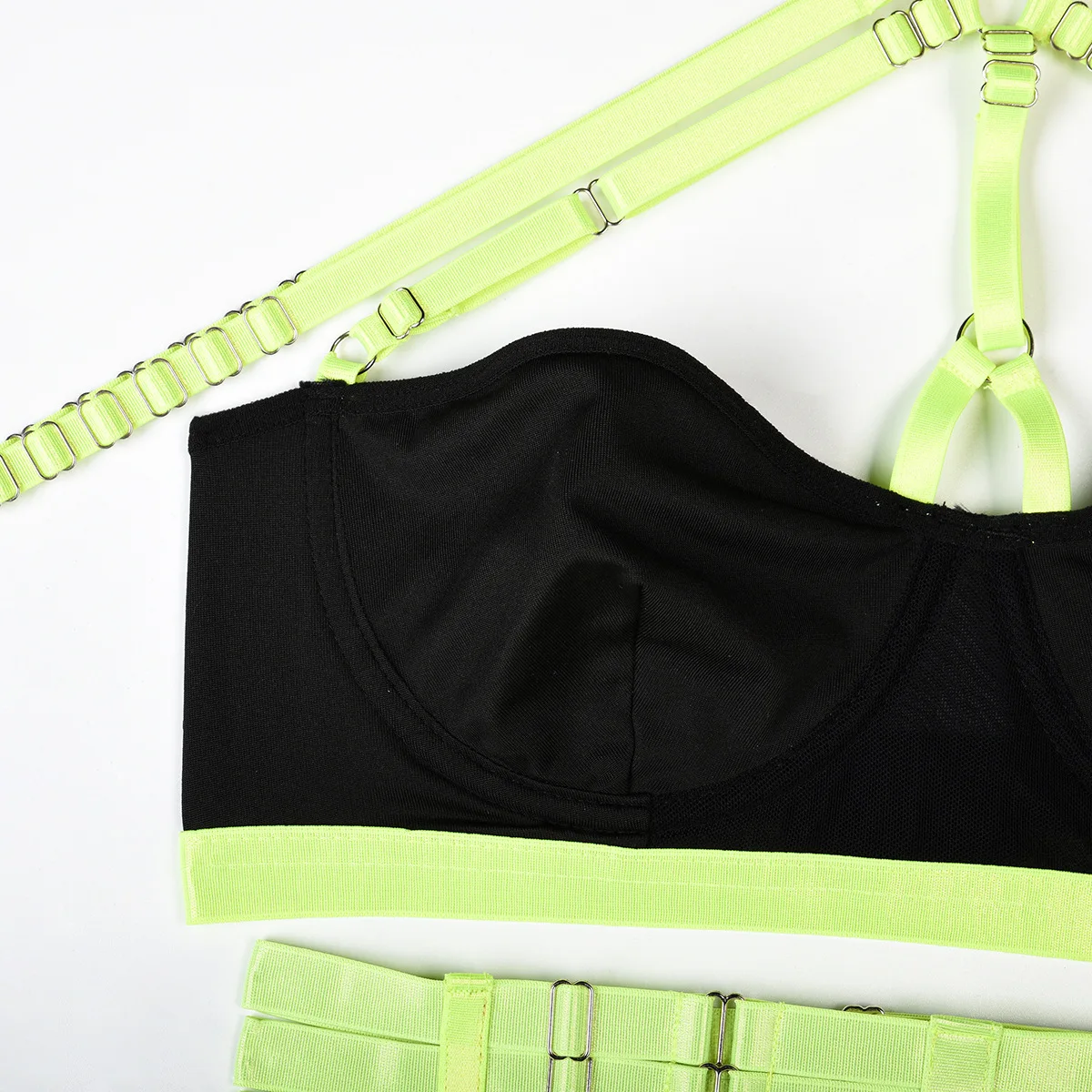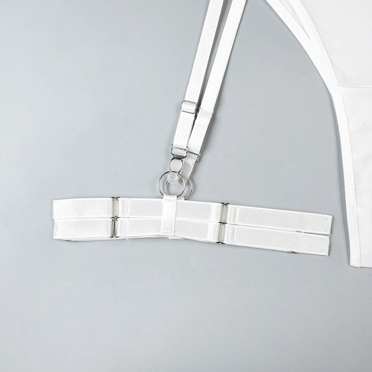 Conjunto de lencería sexy para mujer, con panel de encaje, escote en V profundo, glúteos abiertos, tirantes con forma de corazón de melocotón, cadena cruzada, liguero, ropa interior de tres piezas