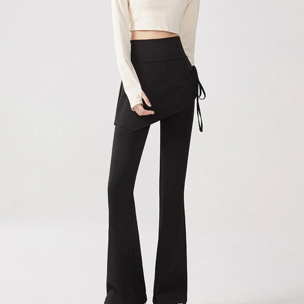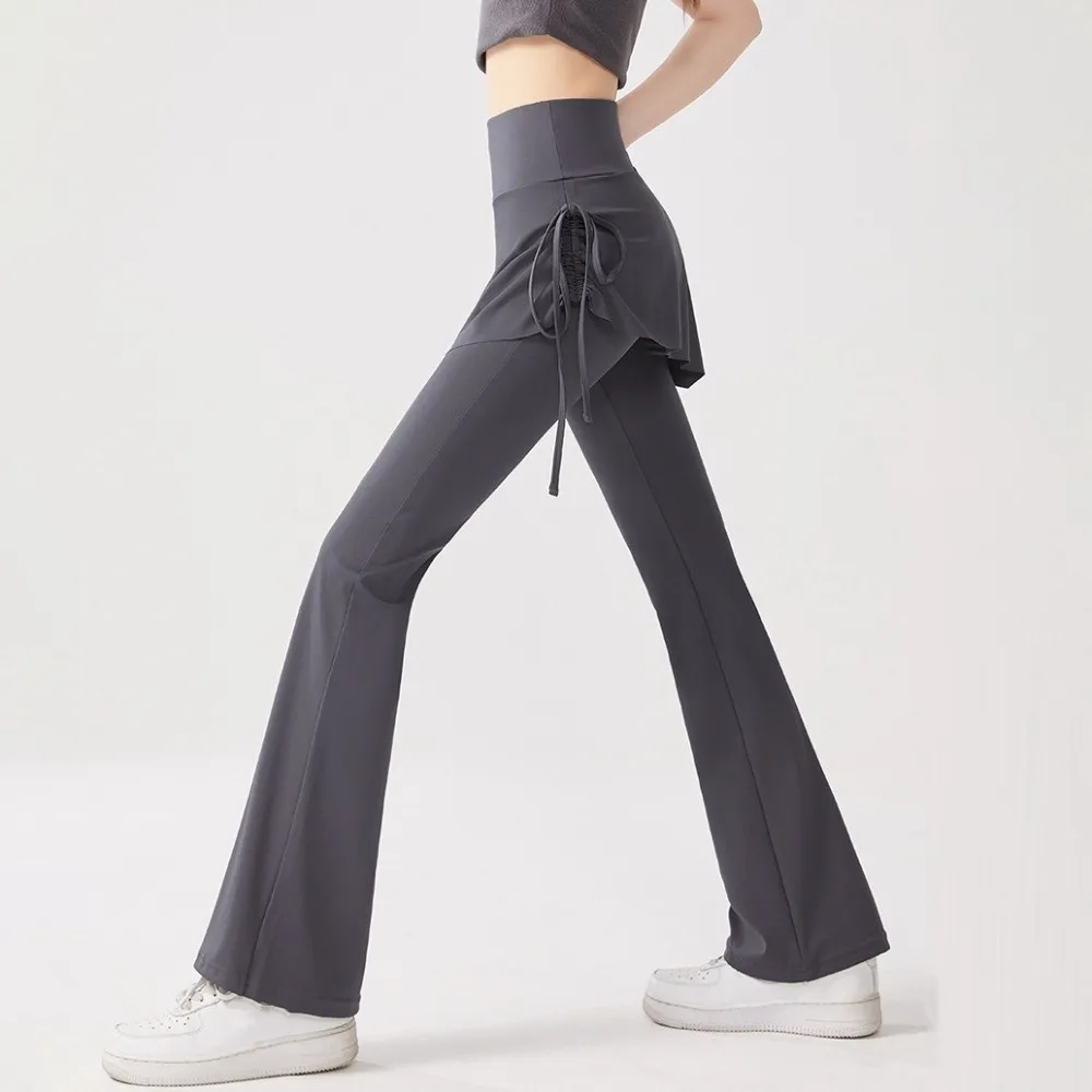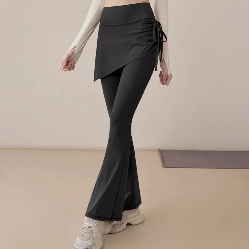 Leggings deportivas 2 en 1 con diseño de falda, dobladillo acampanado, cintura alta y cordón ajustable para yoga, actividades al aire libre y fitness.