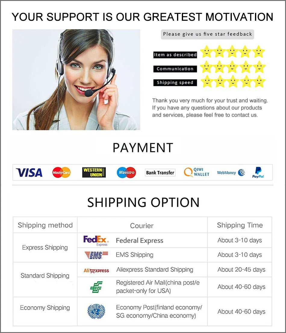4. Si aún no ha recibido la mercancía en un plazo de 45 días, póngase en contacto con nosotros a tiempo. Le daremos una solución satisfactoria. Tenga la seguridad de que sus intereses estarán totalmente protegidos. Gracias.