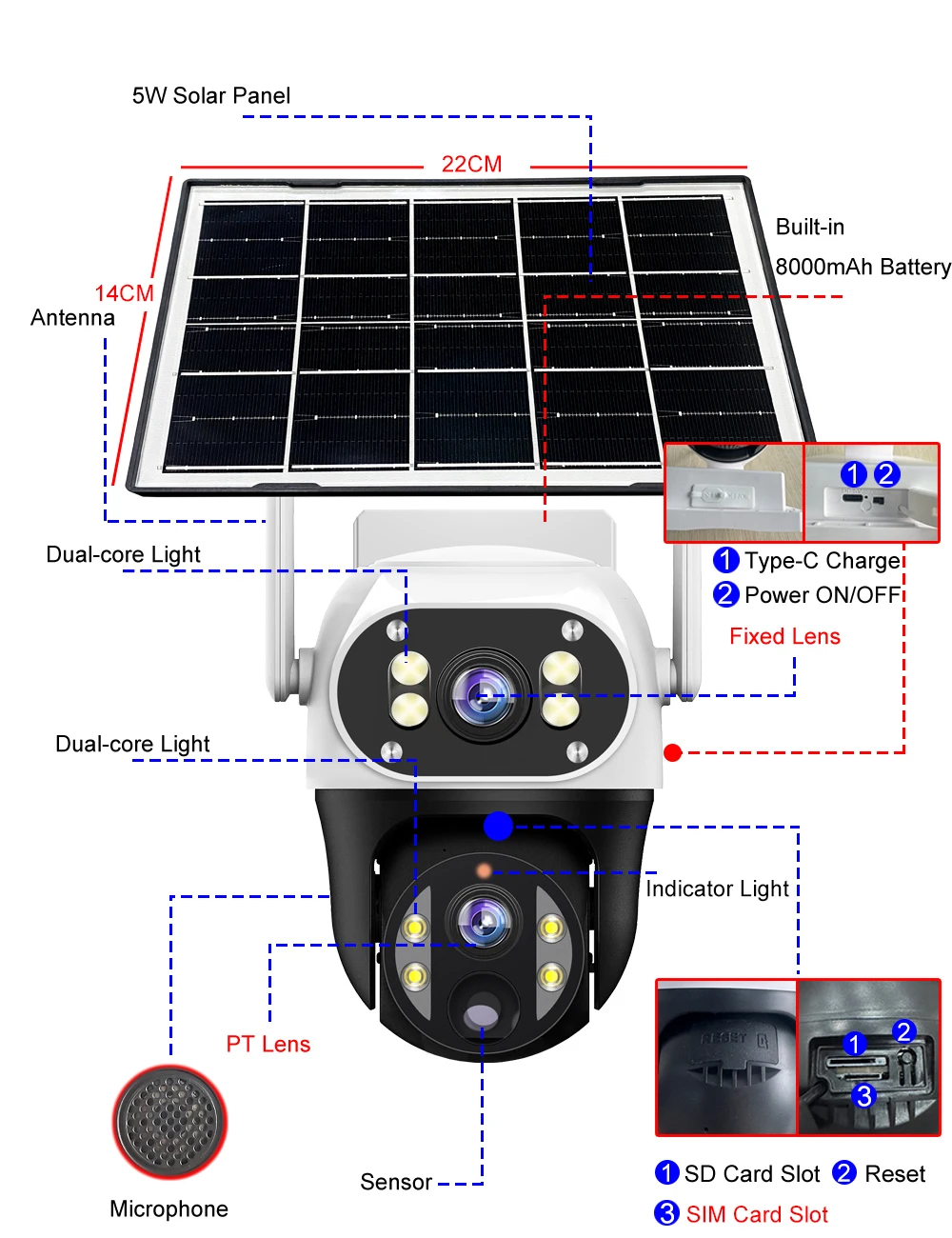 Ranura para tarjeta SIM: inserte la tarjeta SIM 4G en la ranura para tarjeta SIM, lo que proporciona conexión de red móvil a la cámara;