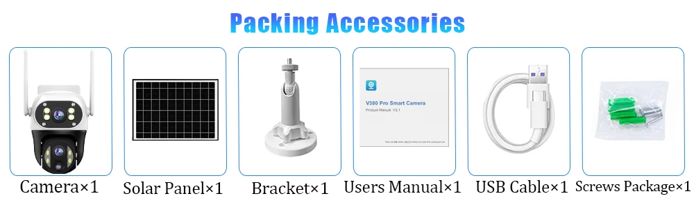 1 cámara, 1 panel solar, 1 soporte, 1 manual de usuario, 1 cable USB, 1 paquete de tornillos