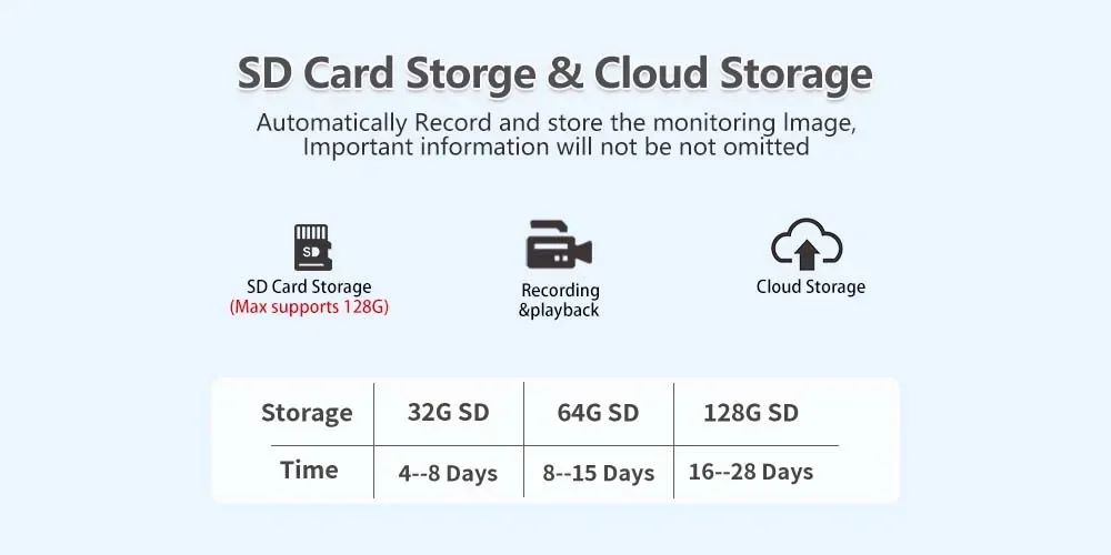 * Admite almacenamiento TF, tarjetas de memoria de hasta 128 GB. Disfruta de un mes de almacenamiento en la nube gratis; también puedes comprar almacenamiento adicional en la app iCsee para no volver a perder tus vídeos importantes.