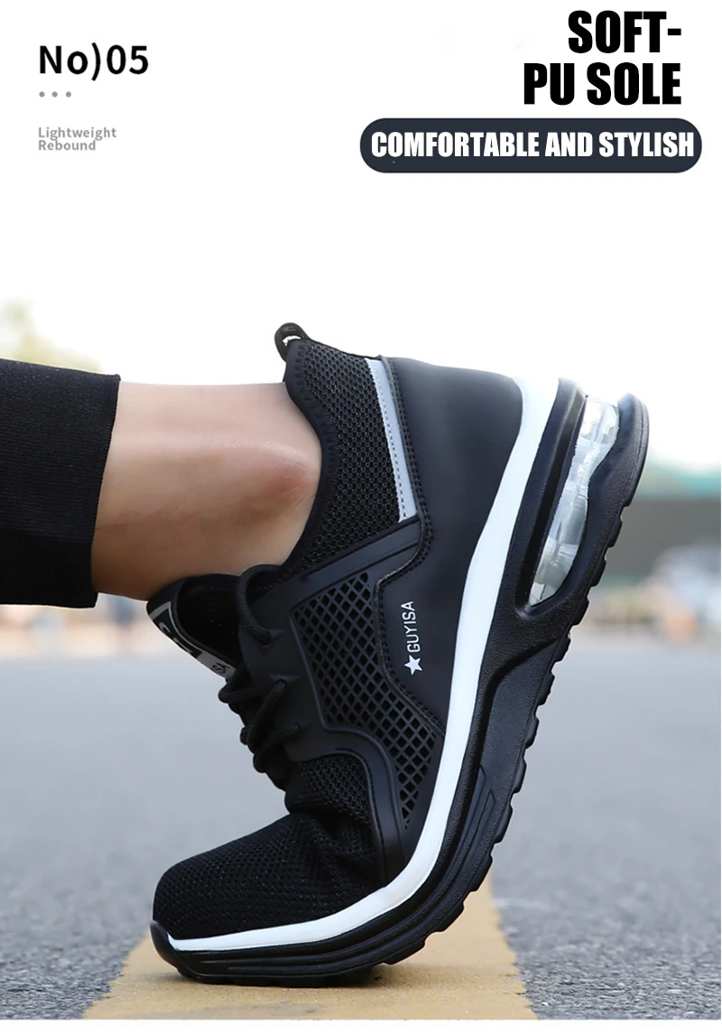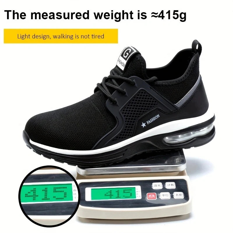 Super light safety shoe:It is like the weight of a pair of running shoes. They can help you to work happily all day without exhausting your feet. With super soft insoles and High elastic sole, your feet are safe and comfortable. Flying knit upper is very soft, Keep your feet comfortable and breathable.