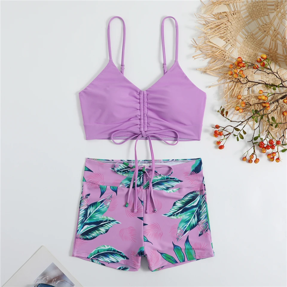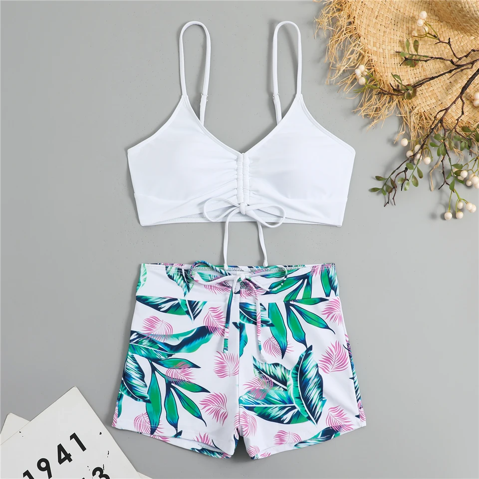 Bikini con cordón y estampado tropical para mujer, traje de baño de cintura alta con lazo frontal, pantalones cortos, traje de baño sexy para mujer, ropa de playa de verano