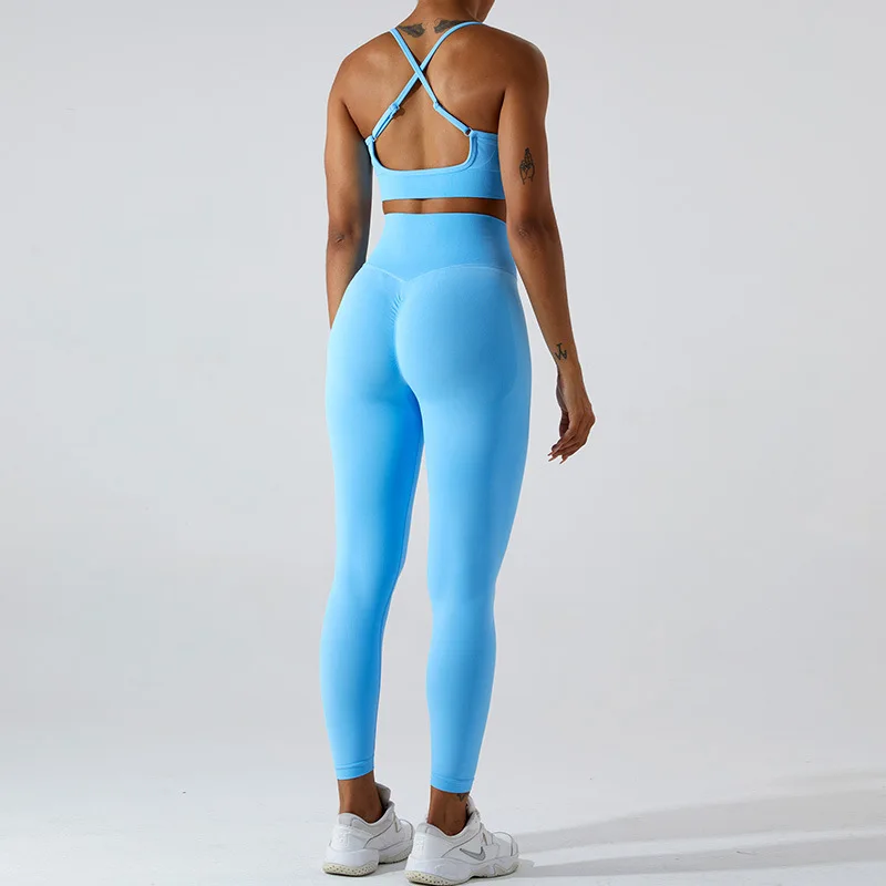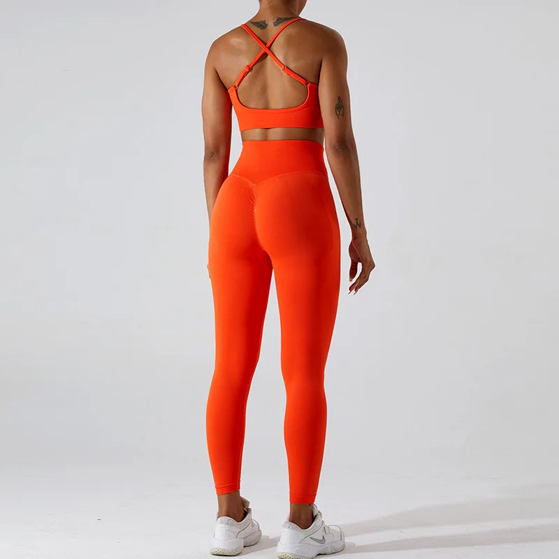 Conjunto de yoga de dos piezas para mujer, sujetador deportivo con espalda cruzada de color liso, top color miel melocotón, leggings de secado rápido para realce de cadera, traje deportivo de fitness