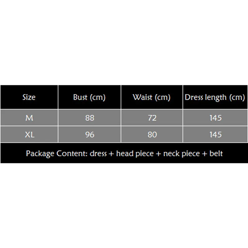 Package content: dress + head piece + neck piece + belt