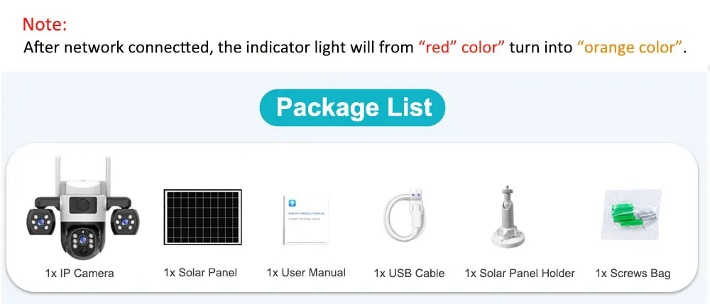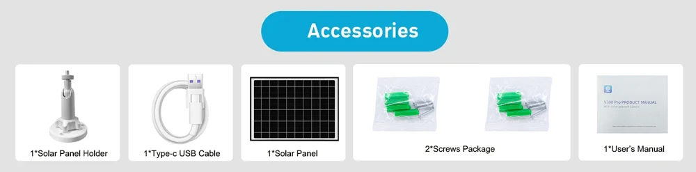 1 cámara 4G, 1 panel solar, 2 paquetes de tornillos, 1 cable USB, 1 soporte para panel, 1 manual de usuario