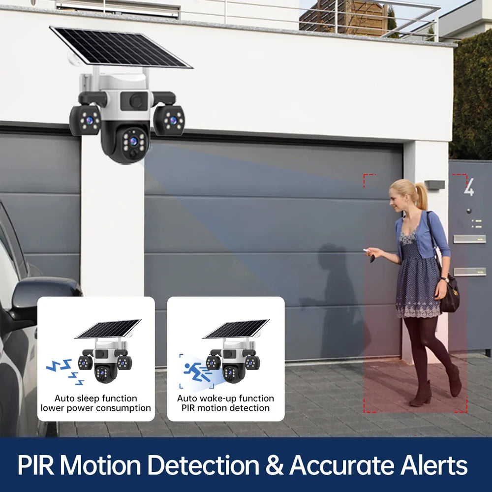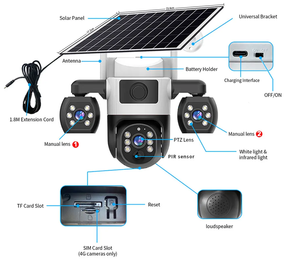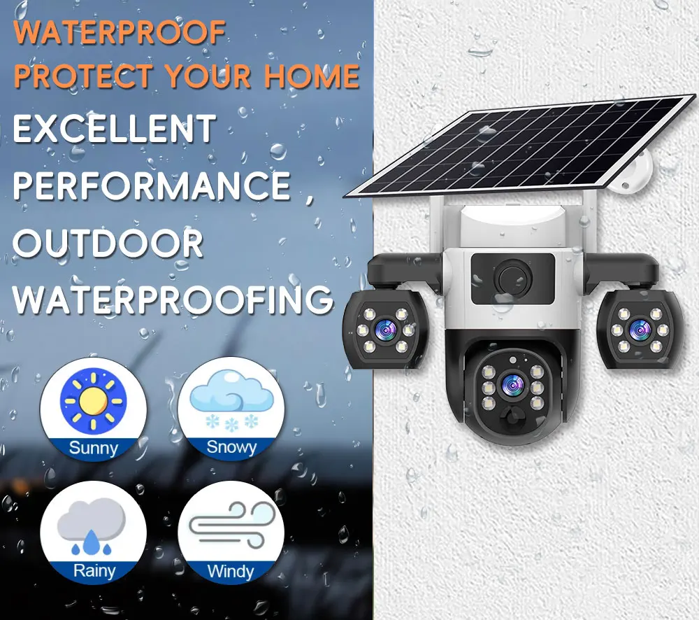 Cámara V380 Pro 4G con tarjeta SIM, panel solar, tres lentes, batería para exteriores, vigilancia doméstica, seguridad y protección (CCTV).
