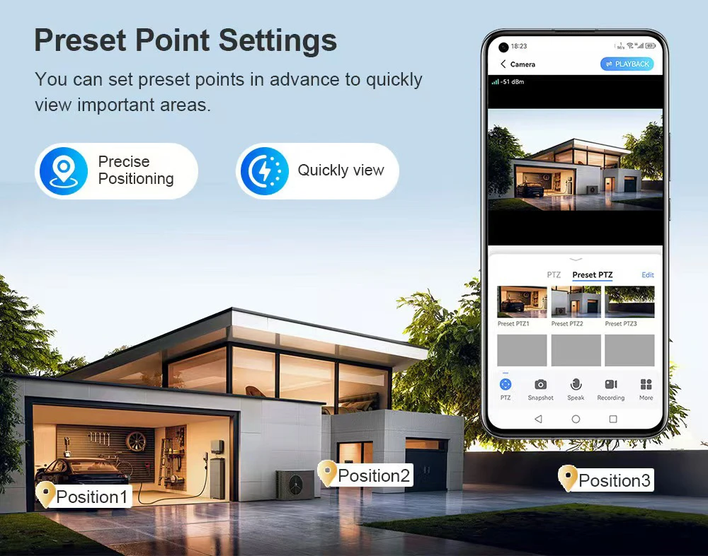 Establezca un punto preestablecido para diferentes direcciones de monitoreo; simplemente haga clic para volver a la dirección desde la que se configuró el punto preestablecido.