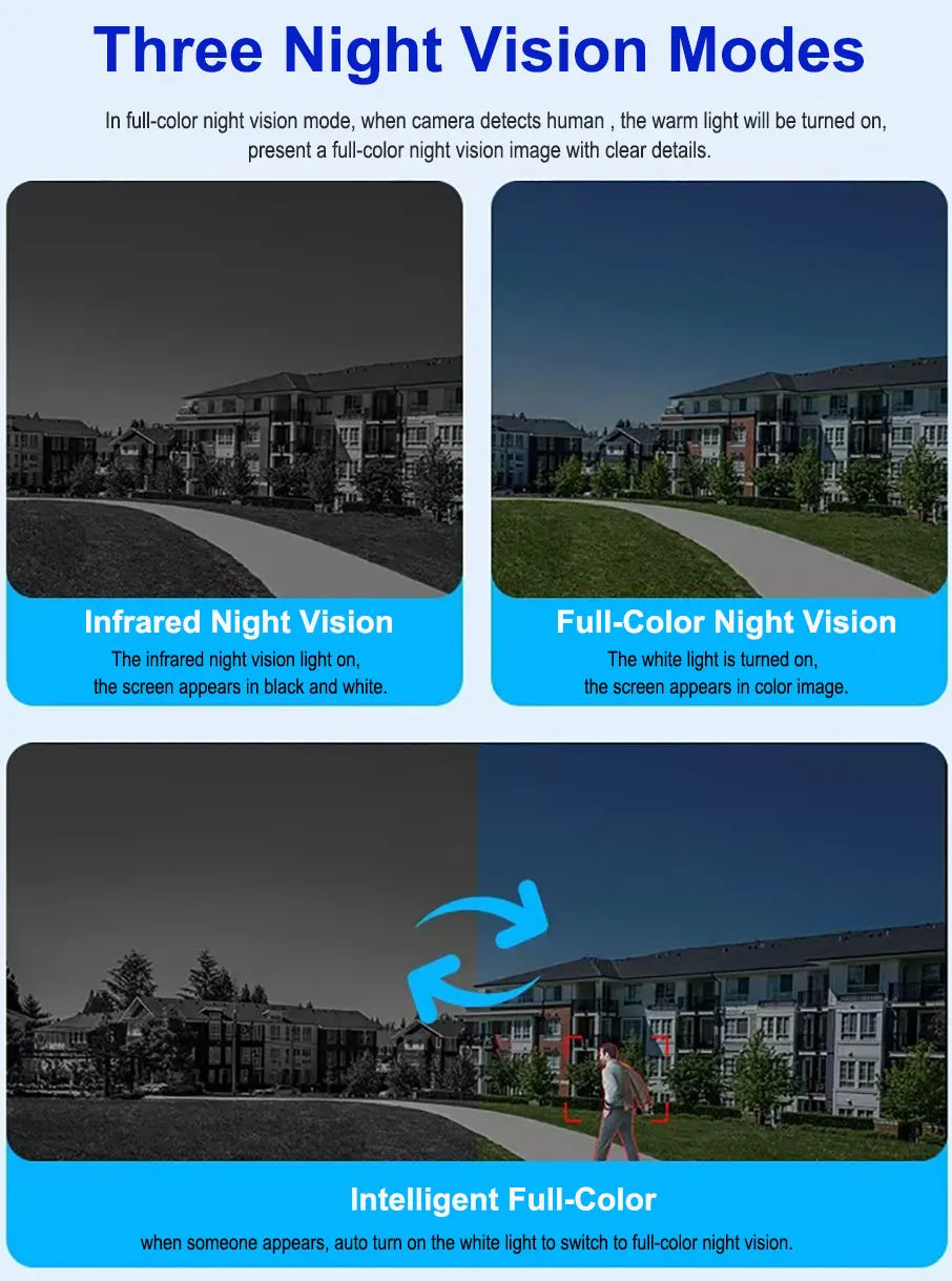 Cuando la cámara detecta rayos infrarrojos emitidos por el cuerpo humano mediante un sensor infrarrojo pasivo (PIR) a una distancia de hasta 10 metros, se activa una alarma. La aplicación recibe una notificación de alarma simultáneamente.