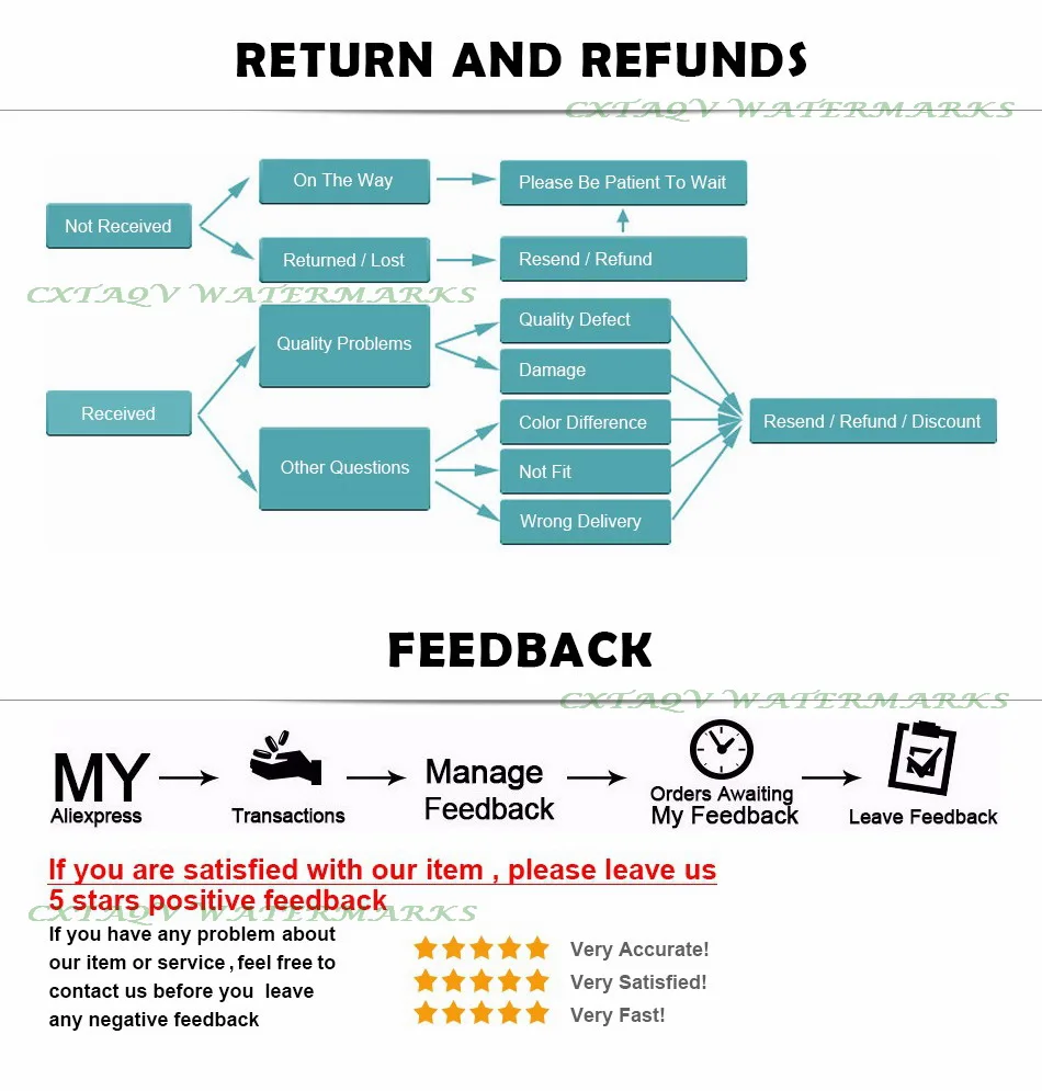 A. If, for any reason you are not satisfied with your purchase, please contact us before leaving neutral or negative feedback, we will get back to you within 24 hours, work with you until you are satisfied. PLEASE DO NOT leave us 1, 2 or 3 stars Detailed Seller Ratings because they will hurt our store but nothing help for issues.