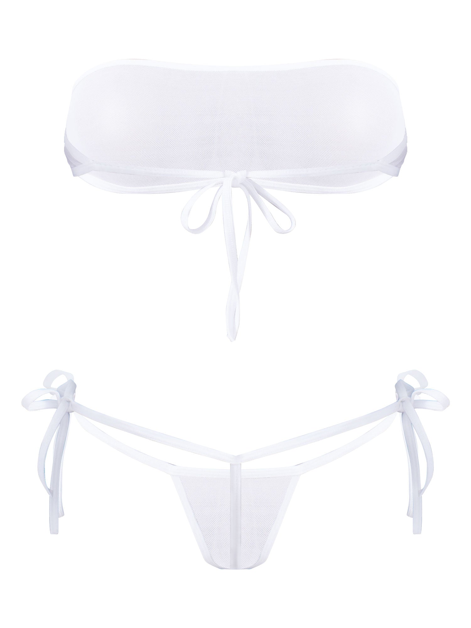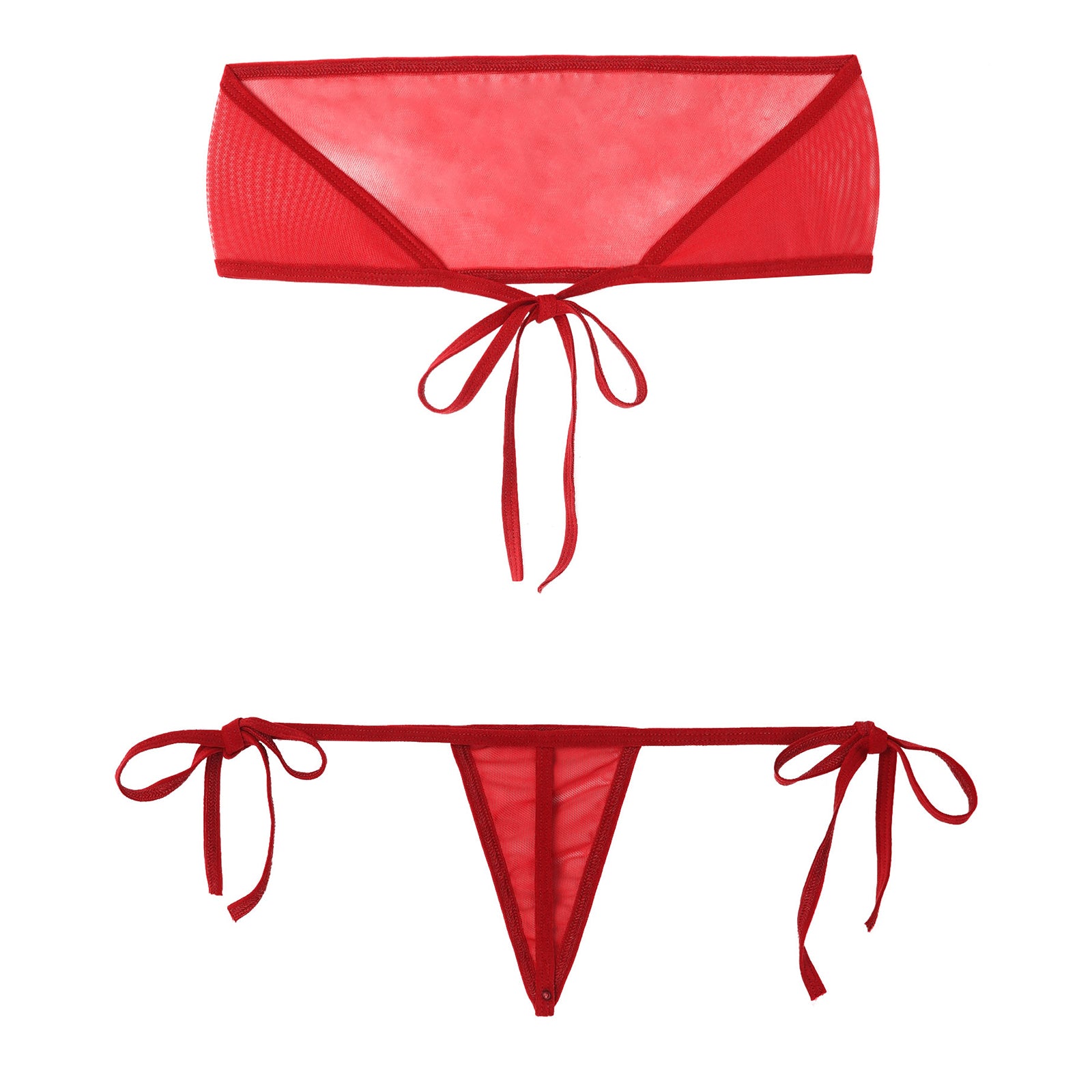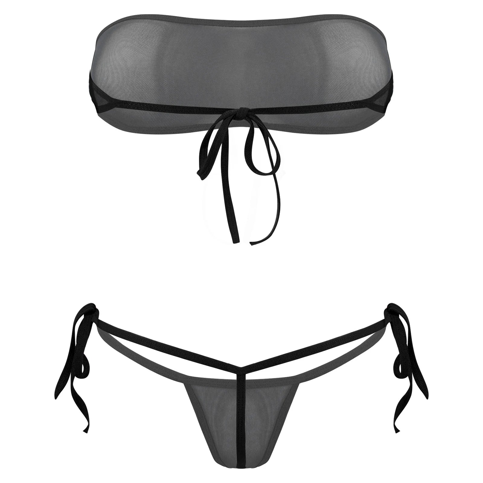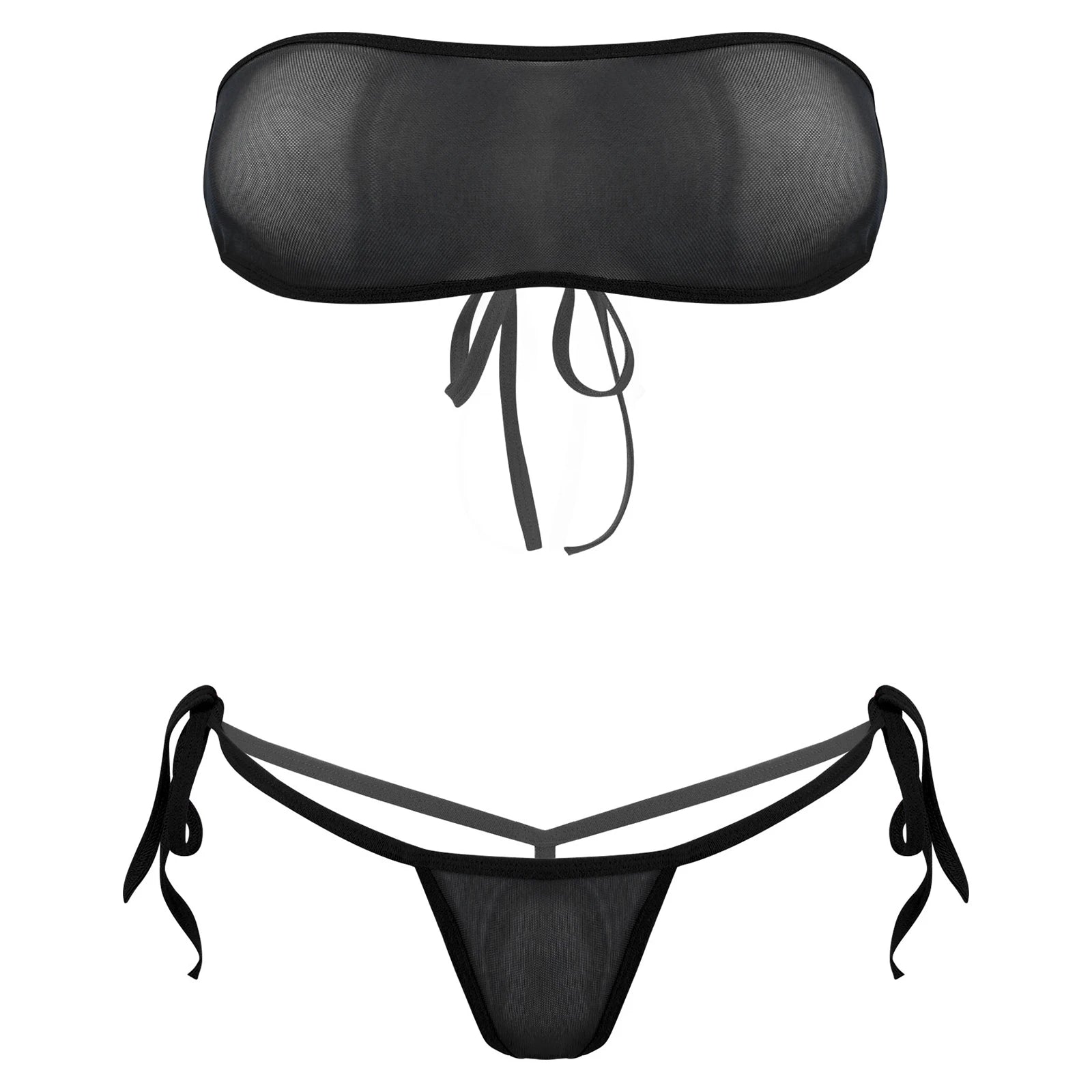 Conjunto de bikini de malla transparente para mujer, traje de baño sin tirantes, sujetador corto con tanga con cordones.