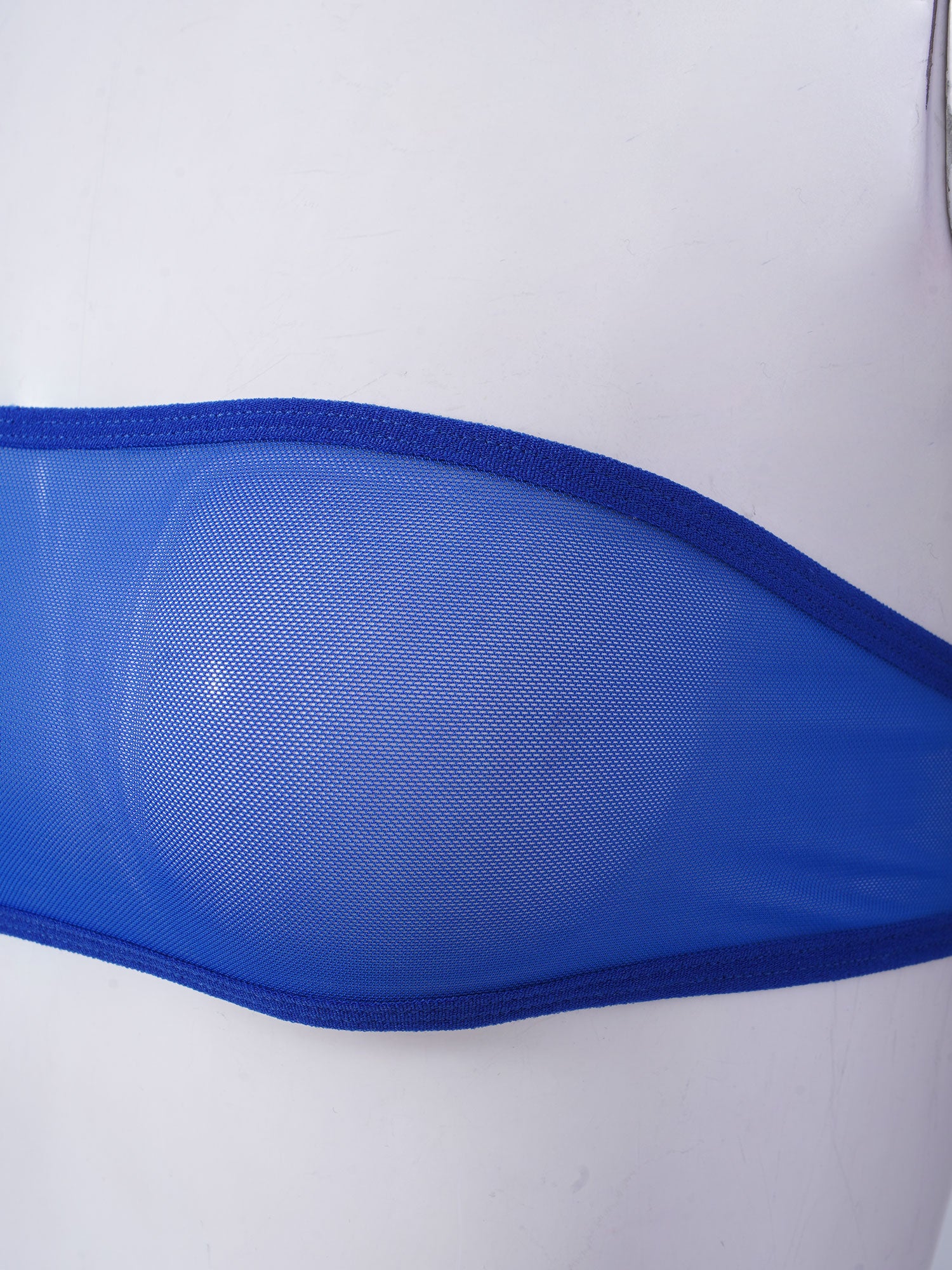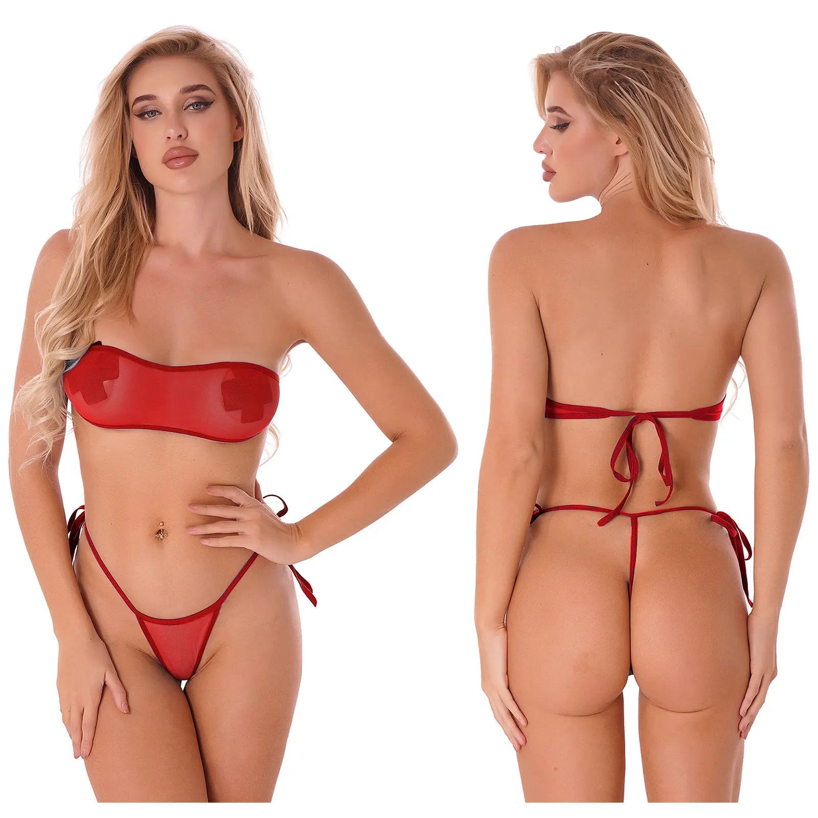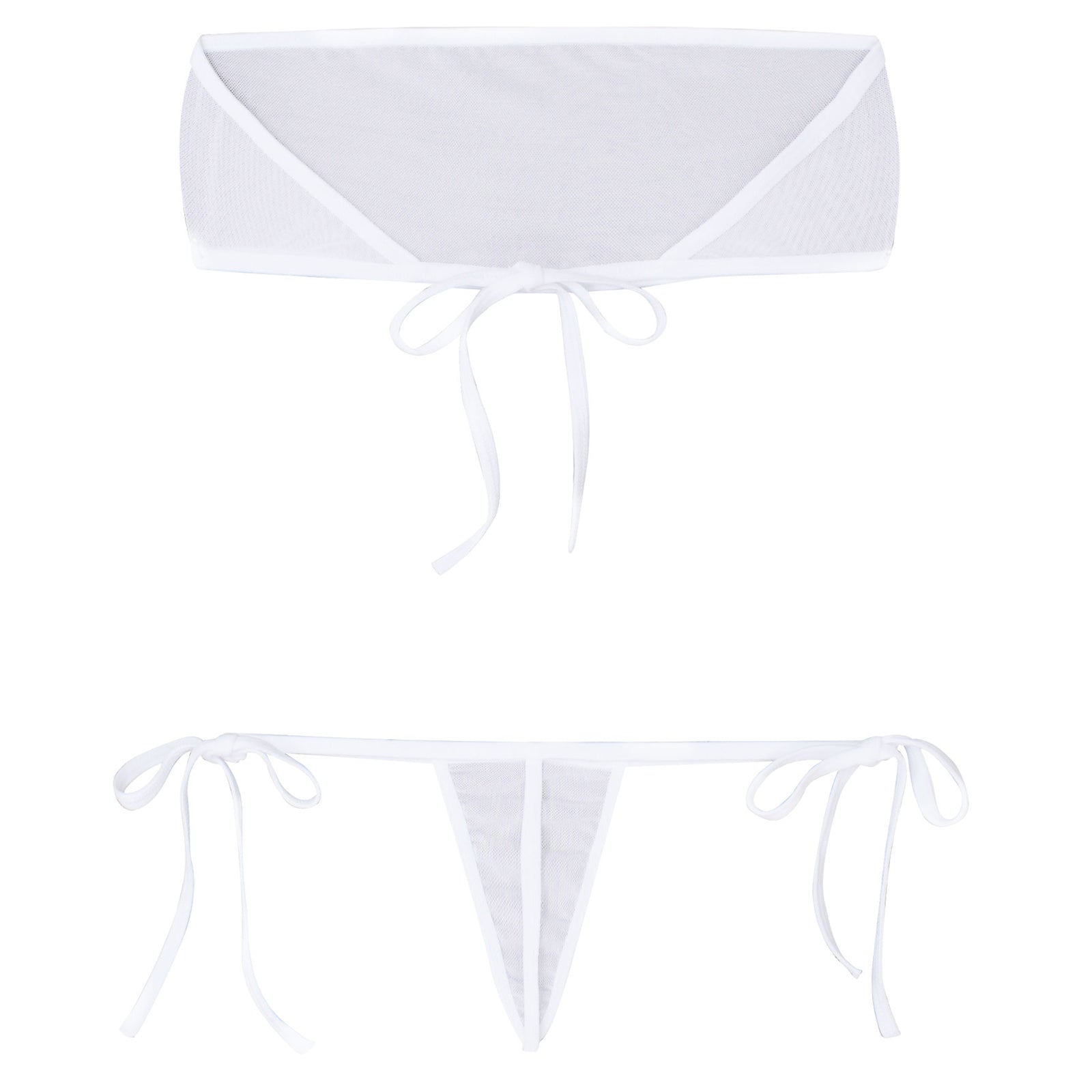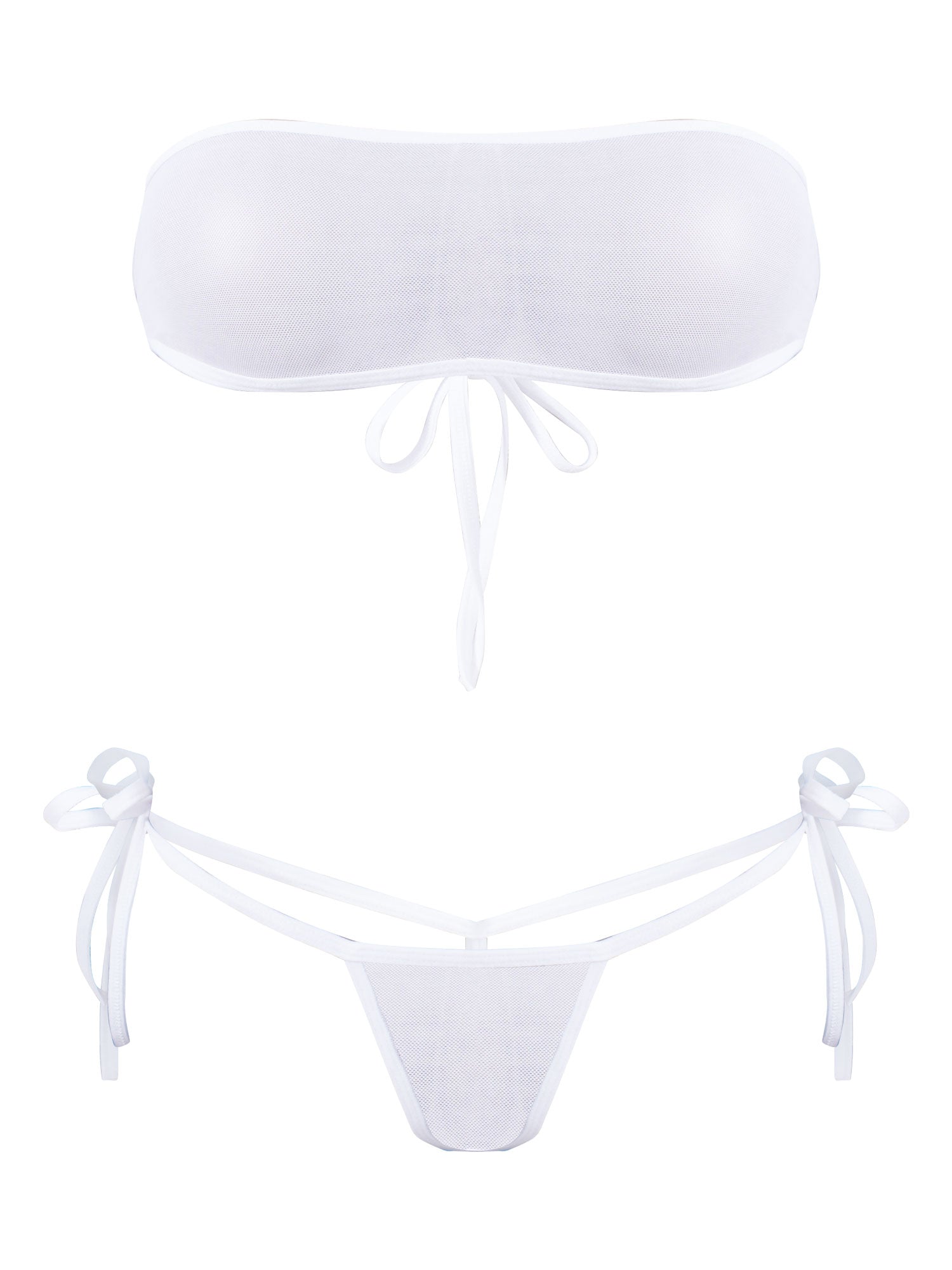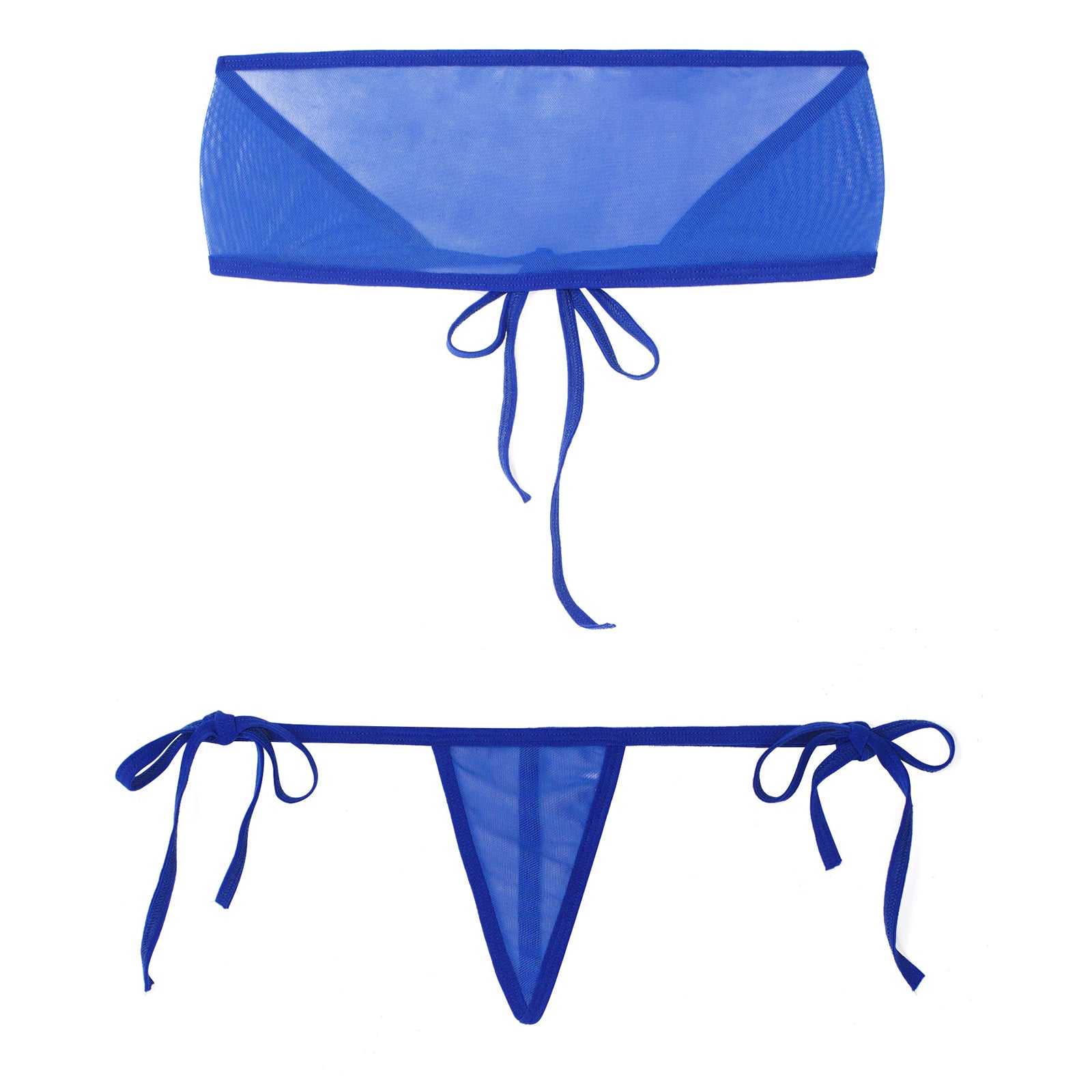 Conjunto de bikini de malla transparente para mujer, traje de baño sin tirantes, sujetador corto con tanga con cordones.