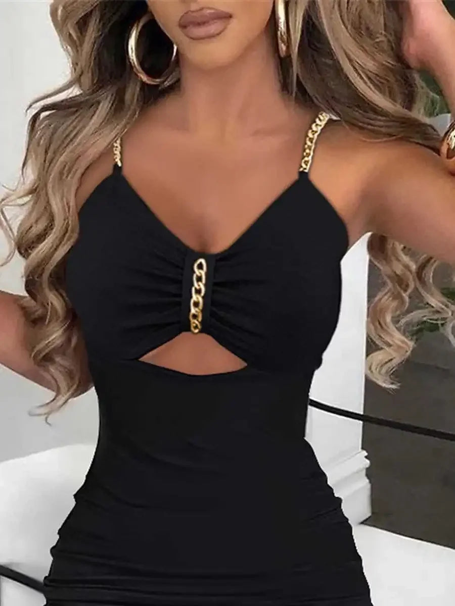 Women Side Split Chain Hollow Sheath Sleeveless V-neck High Waist Sexy Sexy Slim Dress