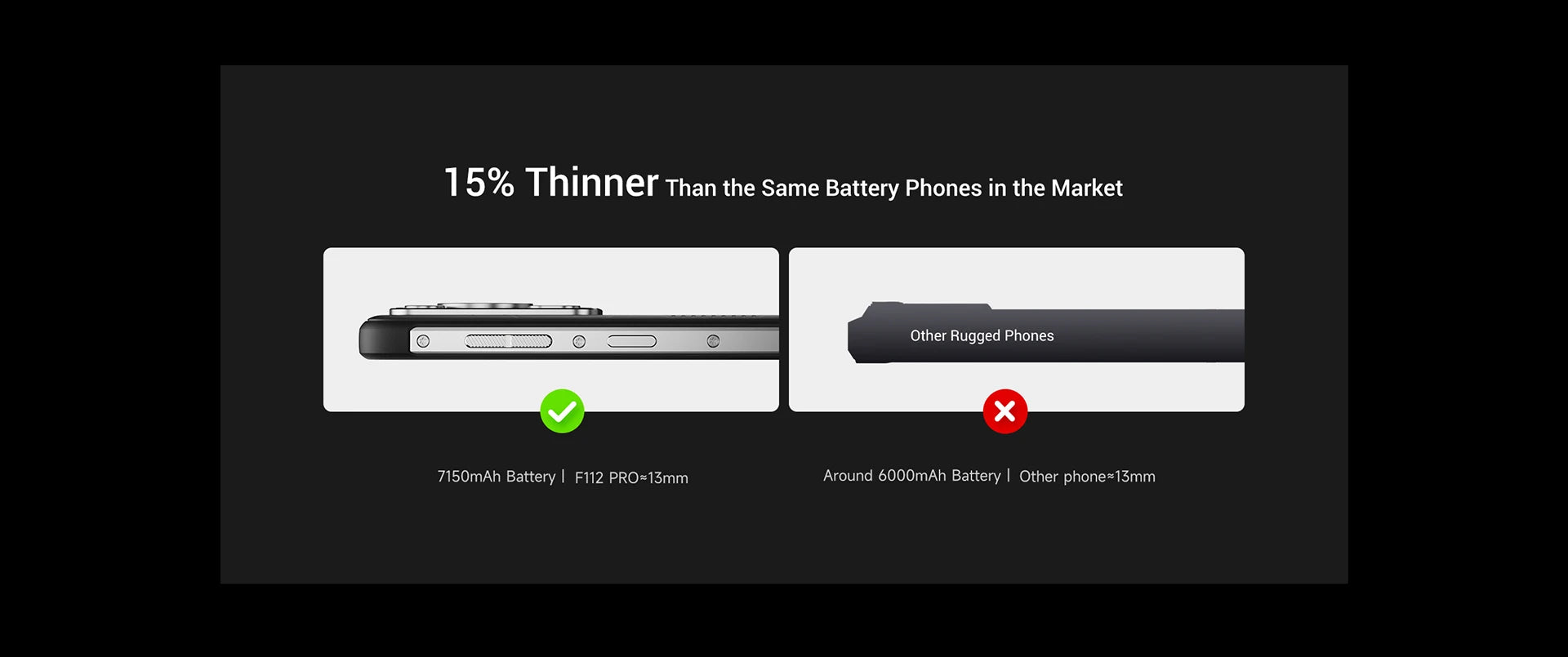 Con su enorme batería de 7150 mAh, el F112 Pro proporciona una autonomía sin límites y ofrece fácilmente más de 12 días de tiempo en espera con una sola batería S1M insertada.