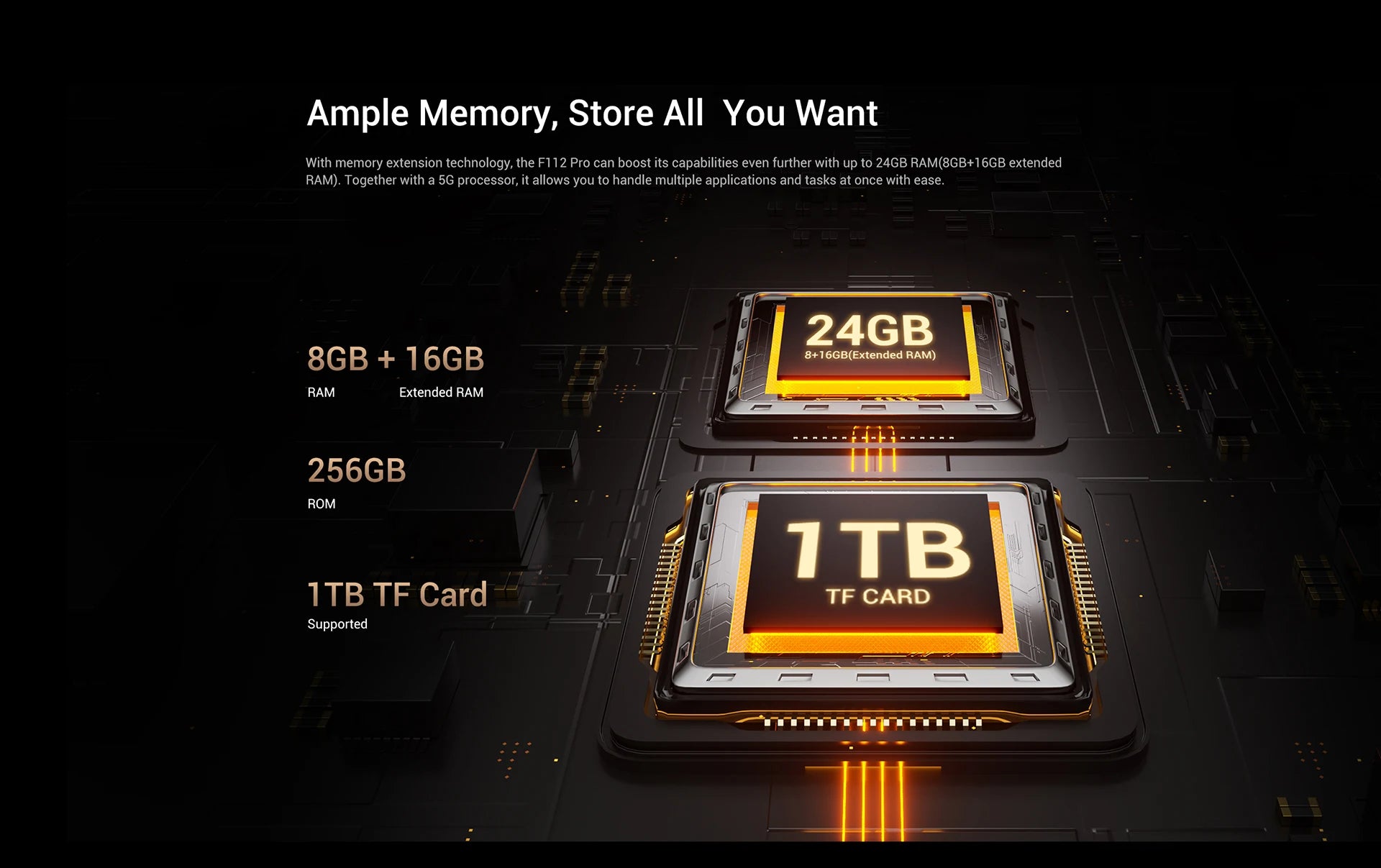Gracias a su tecnología de expansión de memoria, la F112 Pro puede potenciar aún más sus capacidades con hasta 24 GB de RAM (8 GB + 16 GB de memoria expandible).