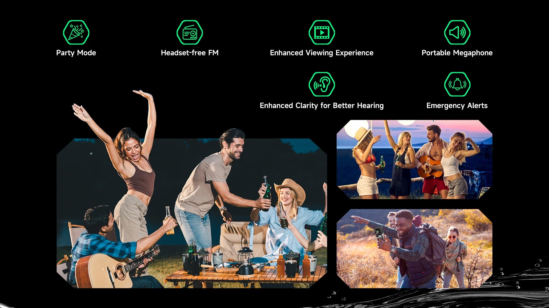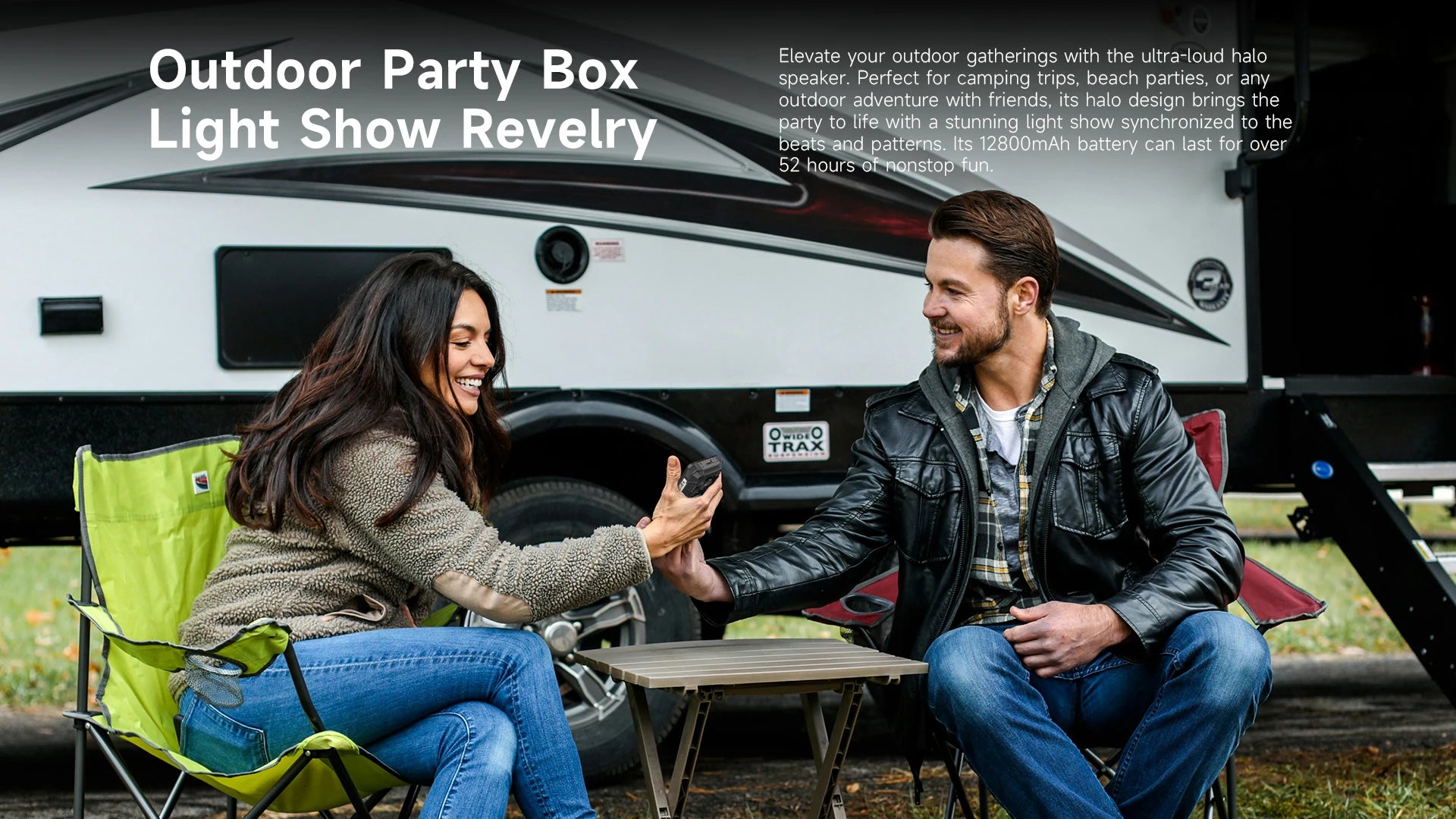 Anima tus reuniones al aire libre con el altavoz Halo de sonido ultra potente. Perfecto para acampadas, fiestas en la playa o cualquier aventura al aire libre con amigos, su diseño Halo da vida a la fiesta con un impresionante espectáculo de luces sincronizado con la música. Su batería de 12800 mAh ofrece más de 52 horas de diversión sin parar.