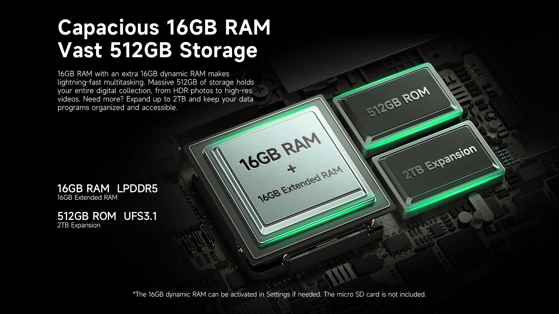 Megabatería de 25500 mAhPantalla trasera de 3,4" | Infinite Halo 2.0 | Altavoz de 118 dB | Hasta 32 GB + 512 GB de ROM (32 GB de RAM = 16 GB + 16 GB) |