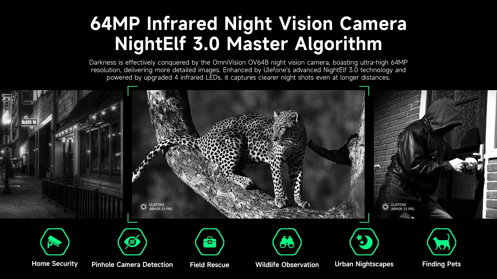 La cámara de visión nocturna OmniVision OV64B, con su resolución ultra alta de 64 MP, conquista la oscuridad y ofrece imágenes más detalladas. Gracias a la avanzada tecnología NightElf 3.0 de Ulefone y a sus 4 LED infrarrojos mejorados, captura imágenes nocturnas más nítidas incluso a mayor distancia.