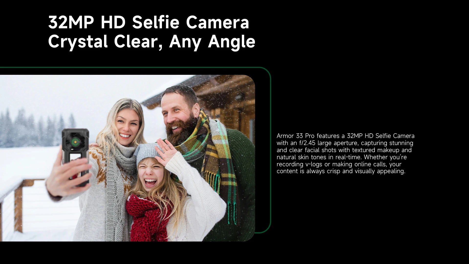 El Armor 33 Pro cuenta con una cámara selfie HD de 32 MP con una gran apertura de f/2.45, que captura retratos nítidos e impresionantes con maquillaje texturizado y tonos de piel naturales en tiempo real. Ya sea que grabes vlogs o realices videollamadas, tu contenido siempre será nítido y visualmente atractivo.