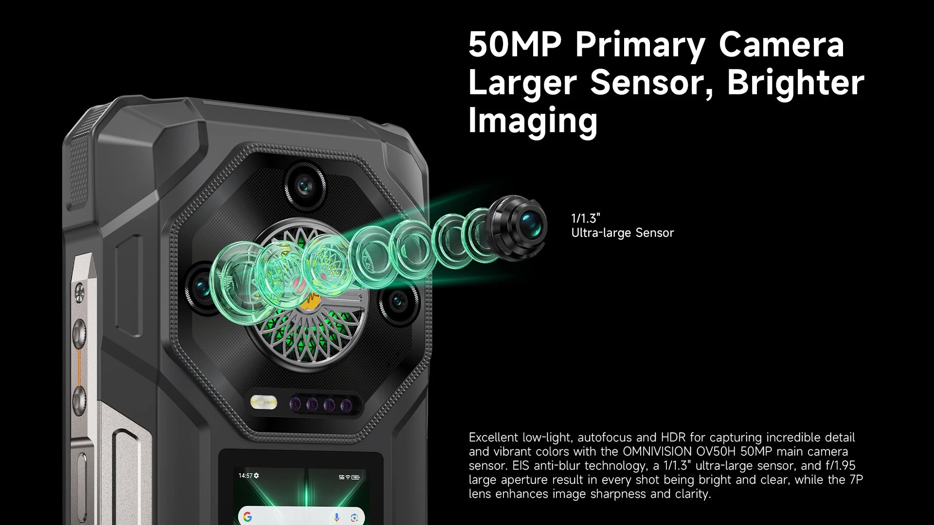 Excelente rendimiento en condiciones de poca luz, autoenfoque y HDR para capturar detalles increíbles y colores vibrantes con el sensor de la cámara principal OMNIVISION OV50H de 50 MP. La tecnología EIS anti-desenfoque, un sensor ultra grande de 1/1.3" y una gran apertura de f/1.95 garantizan imágenes brillantes y nítidas, mientras que el objetivo 7P mejora la nitidez y la claridad de la imagen.