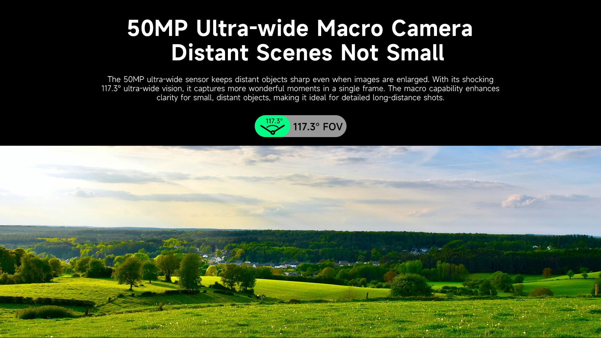 El sensor ultra gran angular de 50 MP mantiene la nitidez de los objetos distantes incluso al ampliar las imágenes. Con su sorprendente visión ultra gran angular de 117,3°, captura más momentos maravillosos en una sola toma. La función macro mejora la claridad de los objetos pequeños y lejanos, lo que la hace ideal para tomas detalladas a larga distancia.