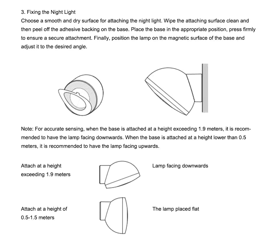 Elija una superficie lisa y seca para colocar la luz nocturna. Limpie la superficie y retire la película protectora de la base. Coloque la base en la posición adecuada y presione firmemente para asegurar una buena fijación. Finalmente, coloque la lámpara sobre la superficie magnética de la base y ajústela al ángulo deseado.