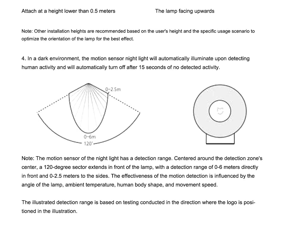 Nota: El sensor de movimiento de la luz nocturna tiene un rango de detección. Centrado en el centro de la zona de detección, se extiende un sector de 120 grados frente a la lámpara, con un rango de detección de 0 a 6 metros directamente al frente y de 0 a 2,5 metros a los lados. La eficacia de la detección de movimiento se ve afectada por el ángulo de la lámpara, la temperatura ambiente, la forma del cuerpo humano y la velocidad de movimiento.