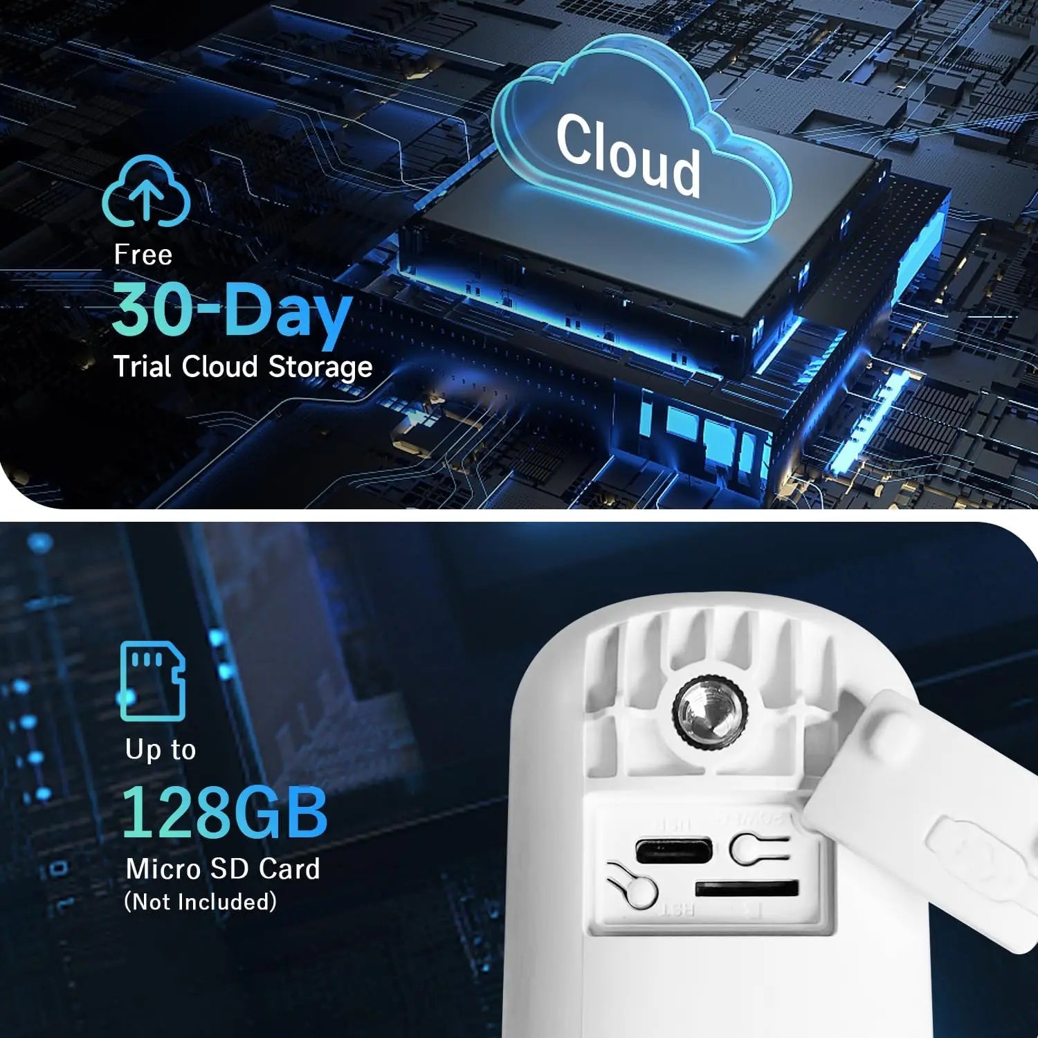 Admite tarjetas TF de hasta 128 GB y almacenamiento en la nube, y ofrece almacenamiento en la nube gratuito durante los primeros 3 días, con una prueba gratuita de 30 días; una vez finalizada la prueba de almacenamiento en la nube, se realizarán los cargos correspondientes.